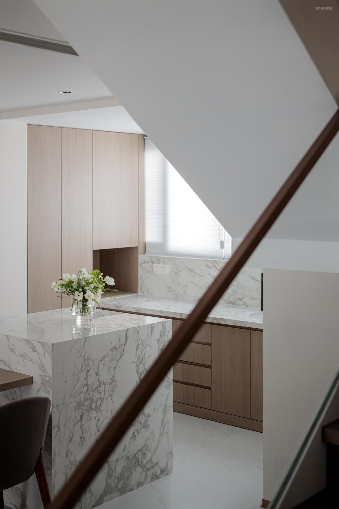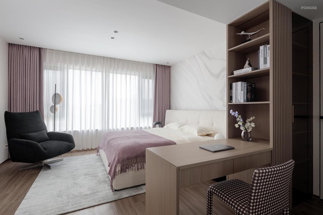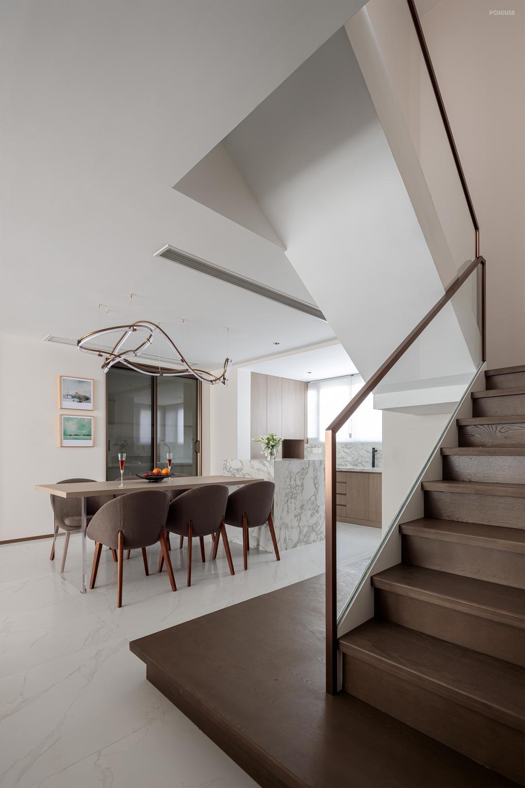 在空间改动上不是很大的动作,因为基础使用条件固定,楼梯上楼方式稍作调整,让楼梯能更加平缓,同时在效果上把第一步加宽处理,做了一个平台,烘托出楼梯的主导位置。在主卧设计上,将卫生间、书桌、睡眠区打通处理,让空间看起来更有层次,也有会给空间带来一种慵懒的、时尚的氛围。