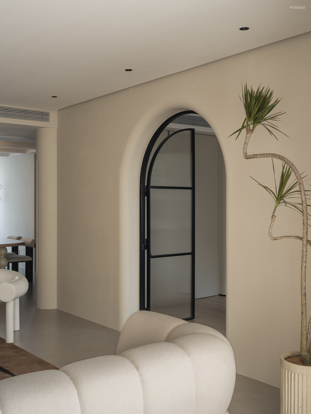 拱形门洞与弧形阳台垭口呼应,转角曲面设计,轻盈柔和。墙角处以饰面板呈现不同层次,用绿植点亮空间,丰富空间质感。