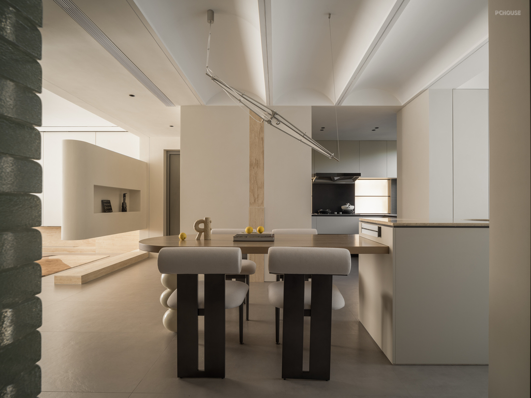定制餐桌岛台,预留高度差,安装轨道插板,便于小型电器使用。弧形面板搭配不规则圆柱桌腿,为规整有序的空间增添几分趣味性。
