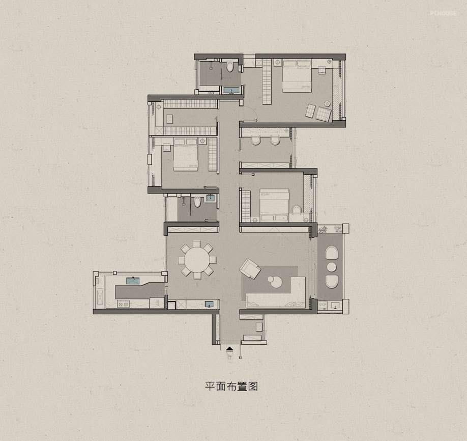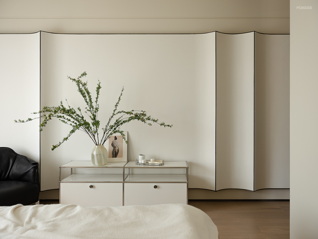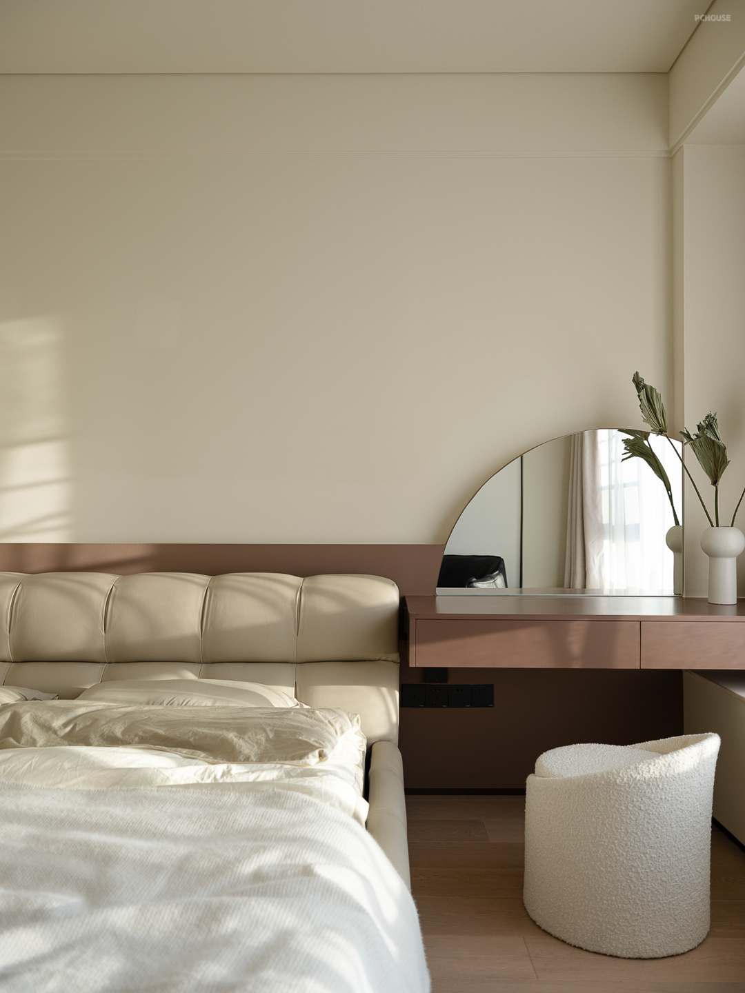 卧室选择柔和的、自然的色调和材质刚好与整个室内环境相协调,这些颜色可以给人带来轻松和宁静的感觉。再摆放一些绿植或花卉,可以让私密的空间增添一份生气和活力。