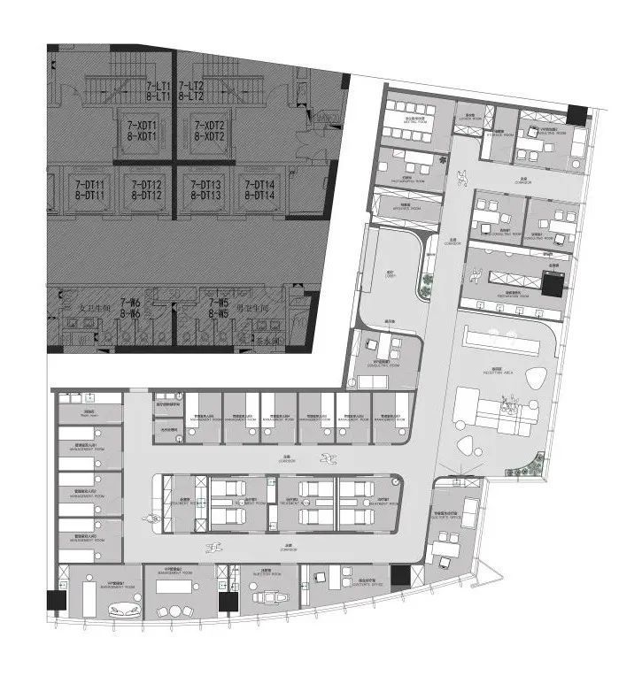 作业区整体采用环形布局,位于中间的治疗室均为两人间,两侧设置移门,缩短顾客移动的路线,也将对同室顾客的干扰降至最低。