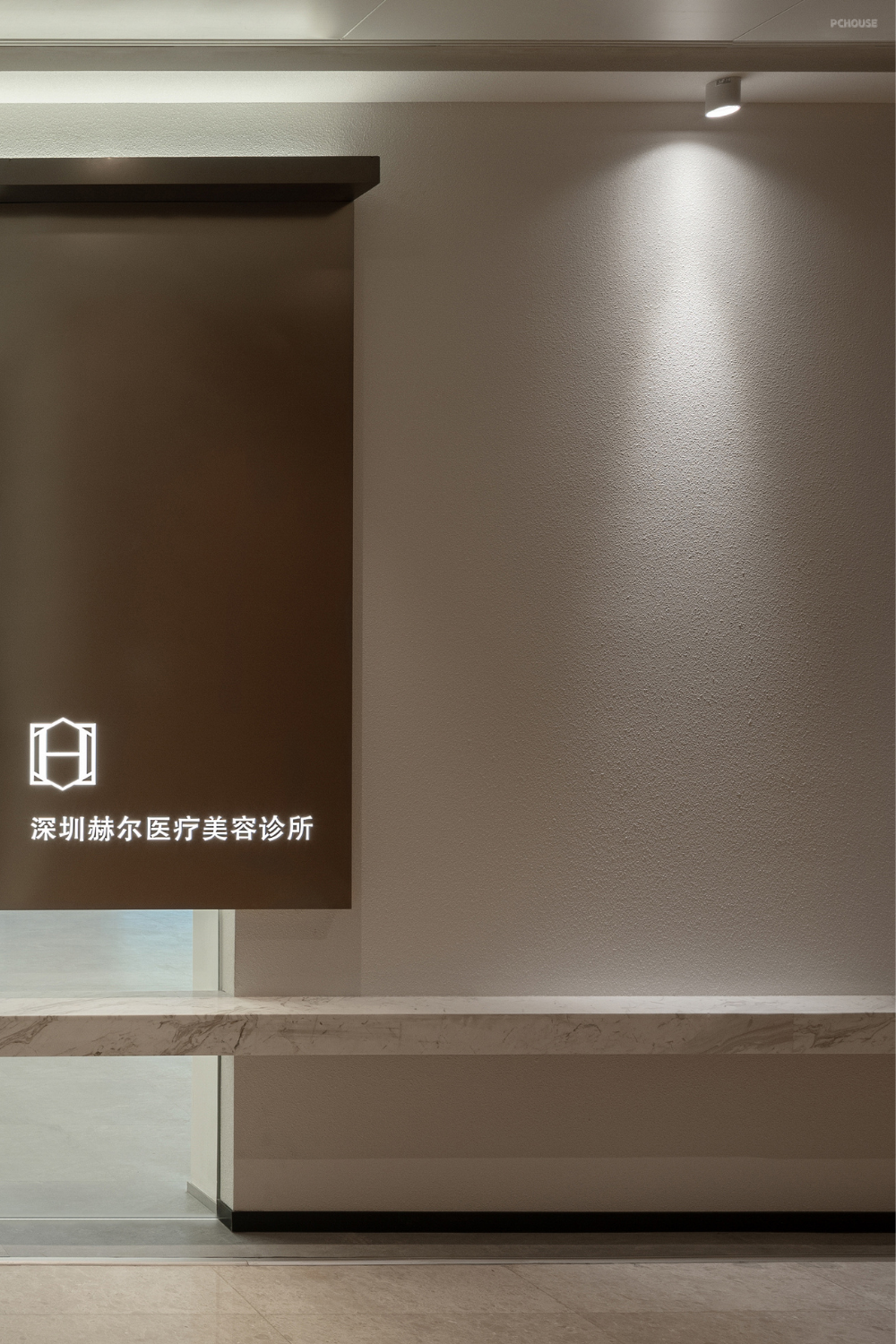 诊所外立面是质朴粗粝的墙面,与半透明的形象墙形成明暗对比,让品牌LOGO更为瞩目。一束光照亮墙面的肌理,恰似某种温柔的呼唤,让走进这里的人们,迎来美丽的新生。