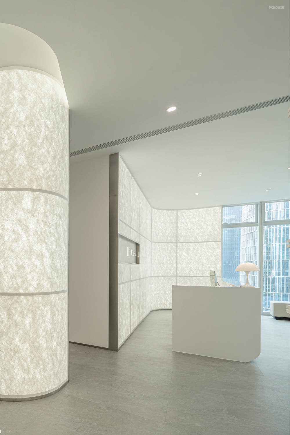 形象墙墙面选用杜邦纸,墙体内藏灯光,形成柔和细腻的光效。杜邦纸在灯光的映衬下,凸显出柔纱材质的肌理感,弥漫细致柔和的气质氛围。这一墙面的创新设计,运用在多个功能空间,成为空间最重要的皮肤,诠释温和、细腻而朦胧的空间情绪。