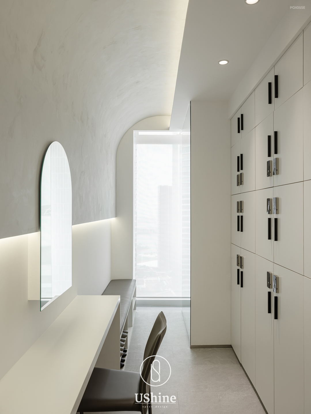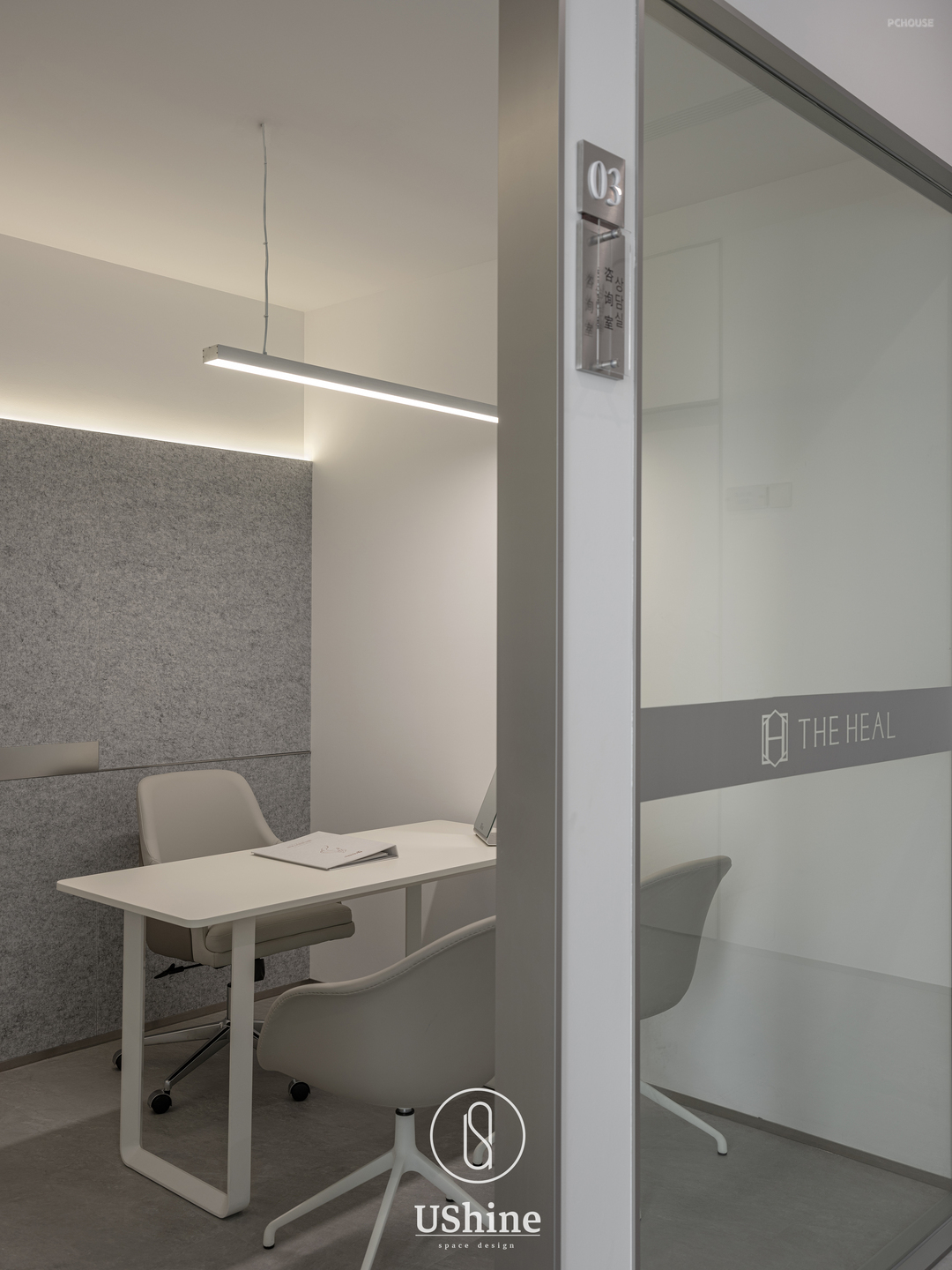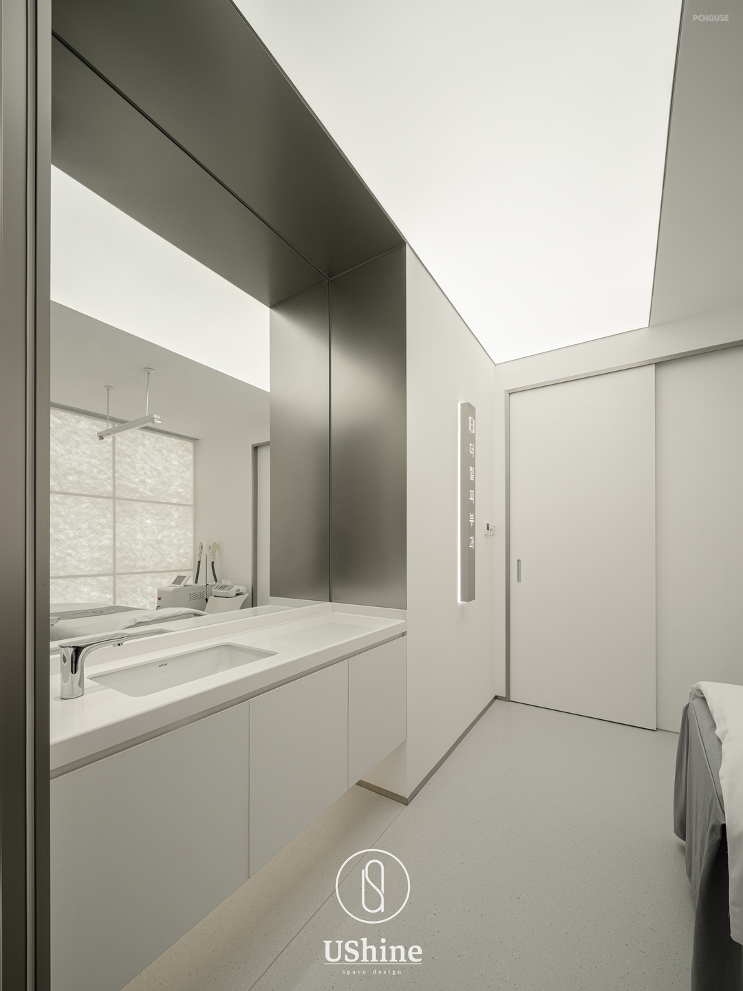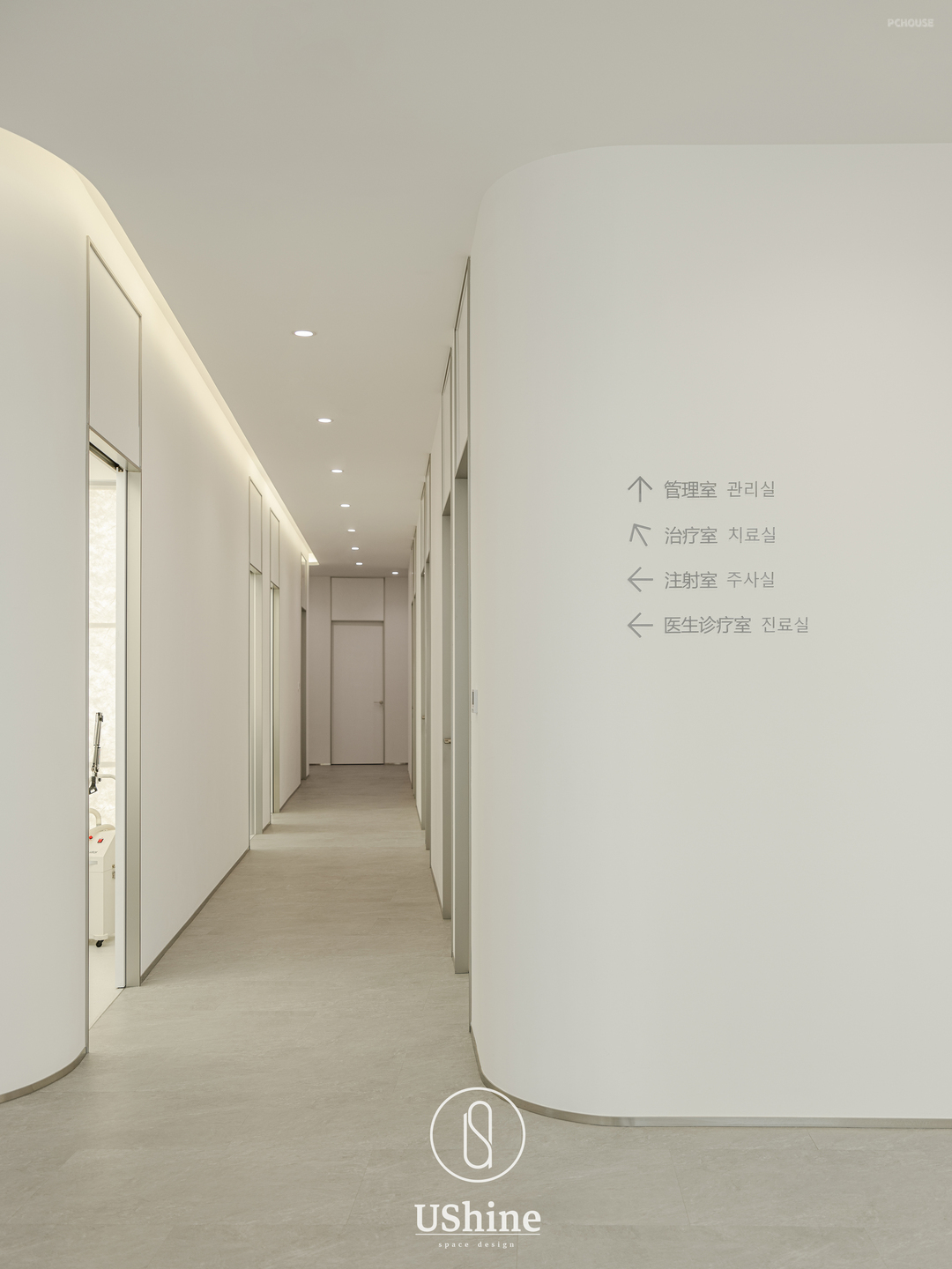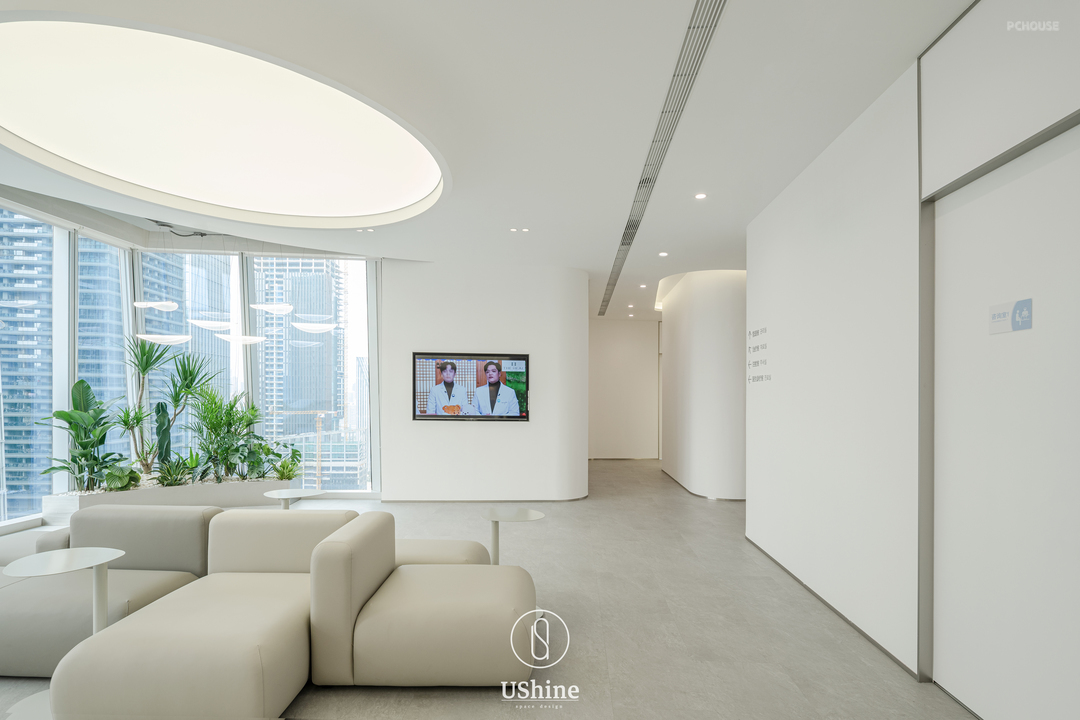 柔和的线条一脉相承,延伸到治疗室和管理室,天花和墙面融合平顺的弧度,照明采用软膜天花的散射光,或隐藏灯带的漫反射光,利落的储物柜和置物台,在极简中达致优雅。