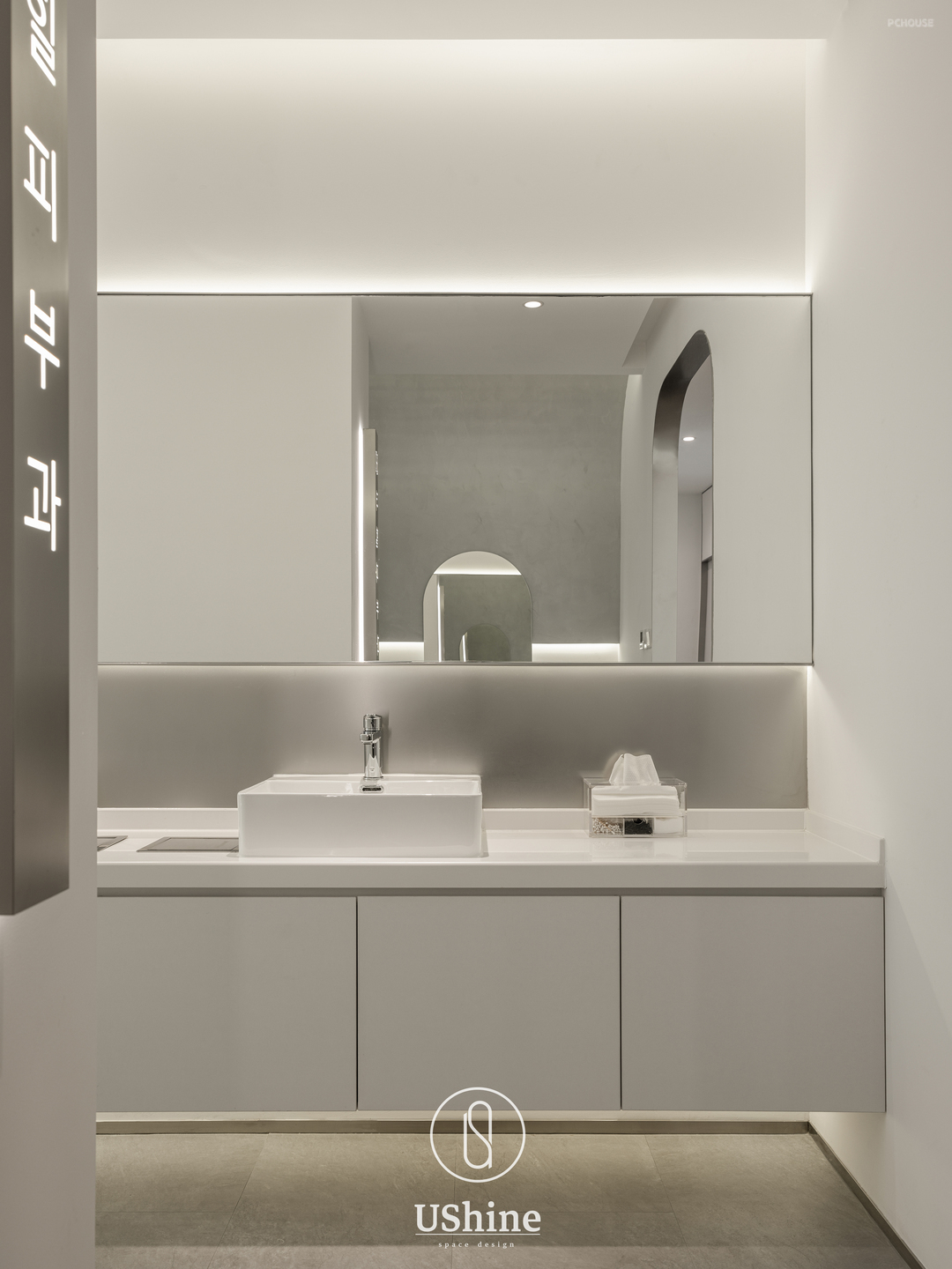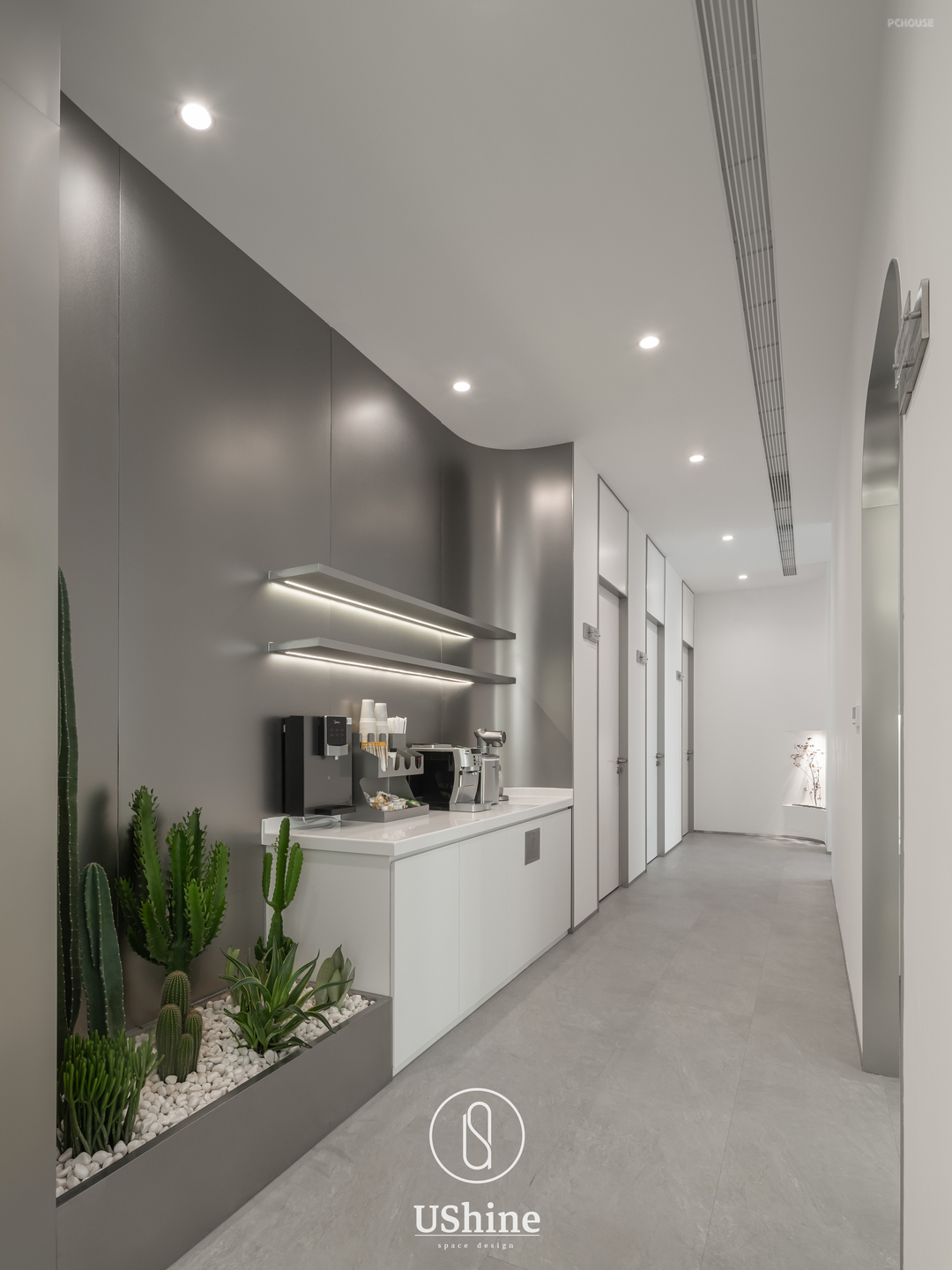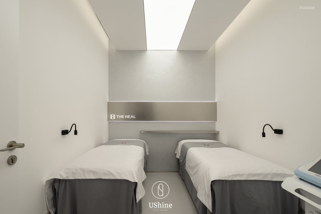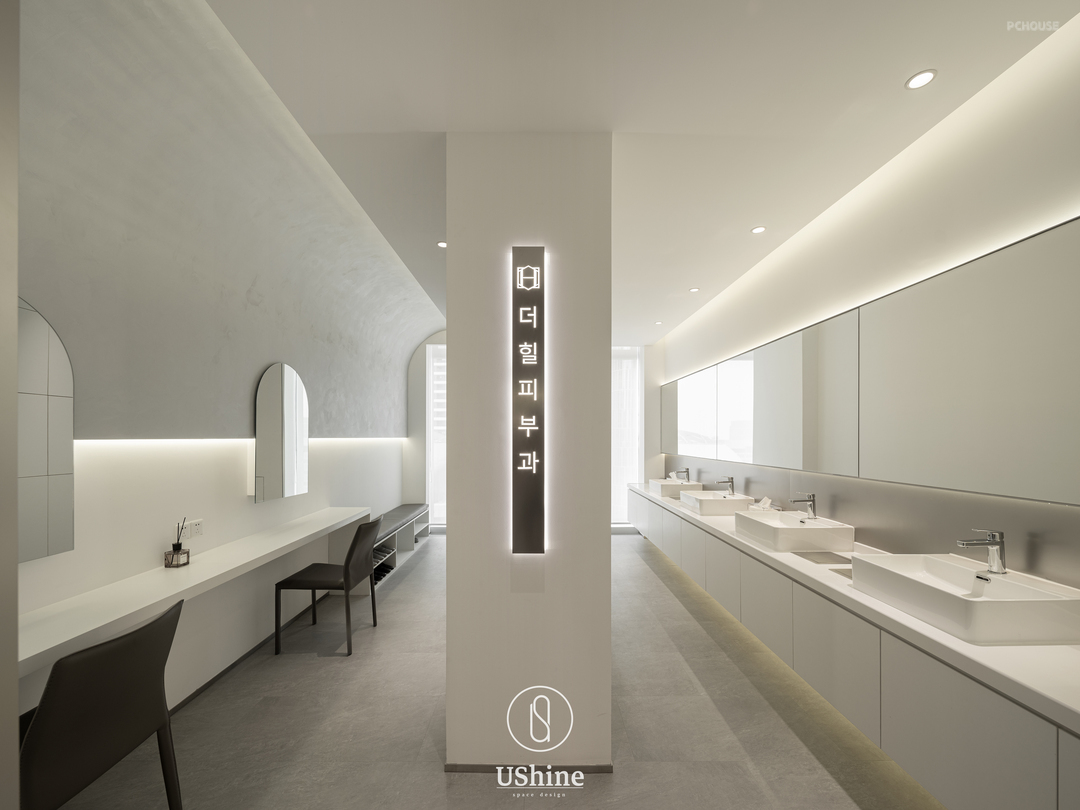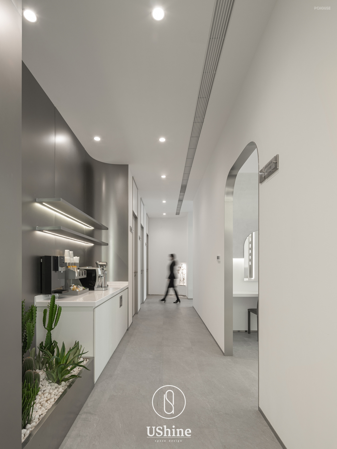 柔和的线条一脉相承,延伸到治疗室和管理室,天花和墙面融合平顺的弧度,照明采用软膜天花的散射光,或隐藏灯带的漫反射光,利落的储物柜和置物台,在极简中达致优雅。