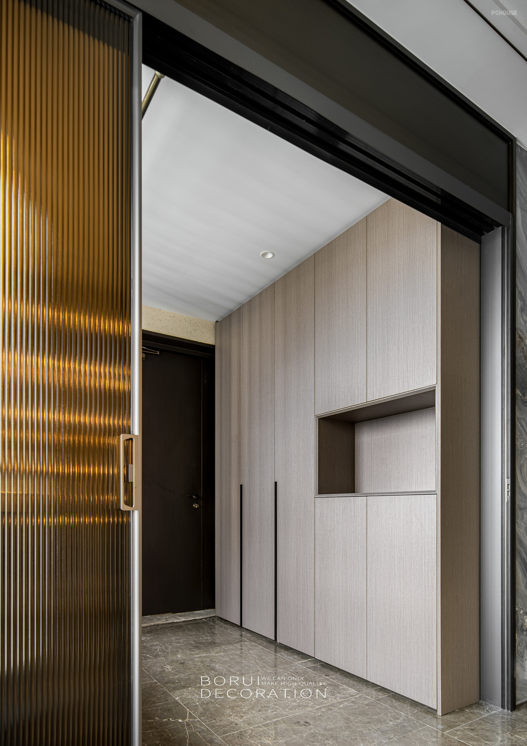入户花园处通往餐厅的推拉门拆除,酒柜背板做长虹玻璃,做成半通透柜子,摆放洋酒和白酒,安放自己独特的兴趣和爱好。