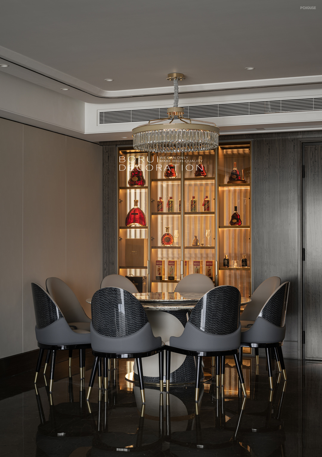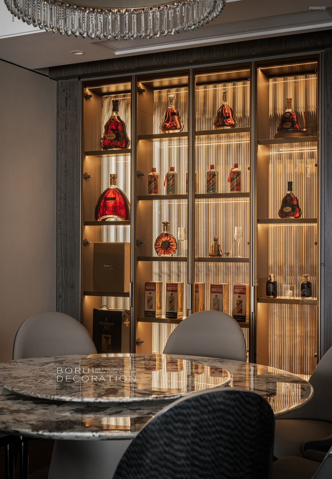 不同以往的餐厅设计,餐厅的酒柜背板做长虹玻璃,背面作为玄关隔断,正视面作为收纳柜,可供放置白酒和洋酒,满足业主大部分的收纳需求和展示需求,搭配内嵌灯带,凸显金色窄边长虹玻璃背板的光影流转,散发出高雅的气息。