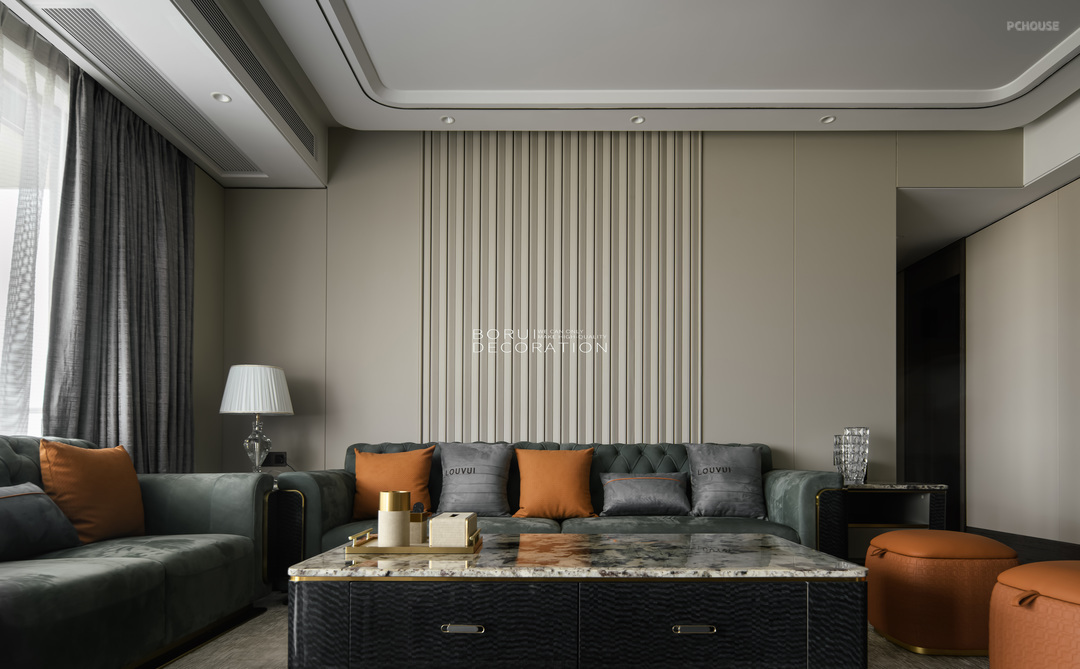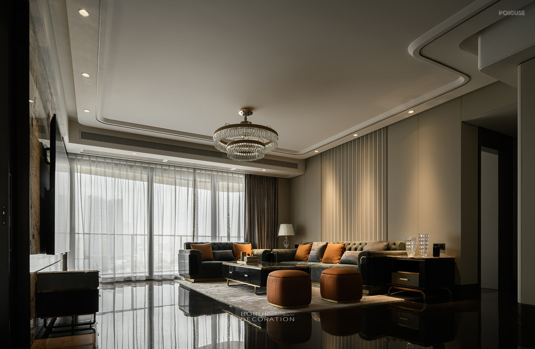客厅的窗帘保留业主喜欢的样板房灰色,整体做智能声控开关,高档大气,彰显品味。