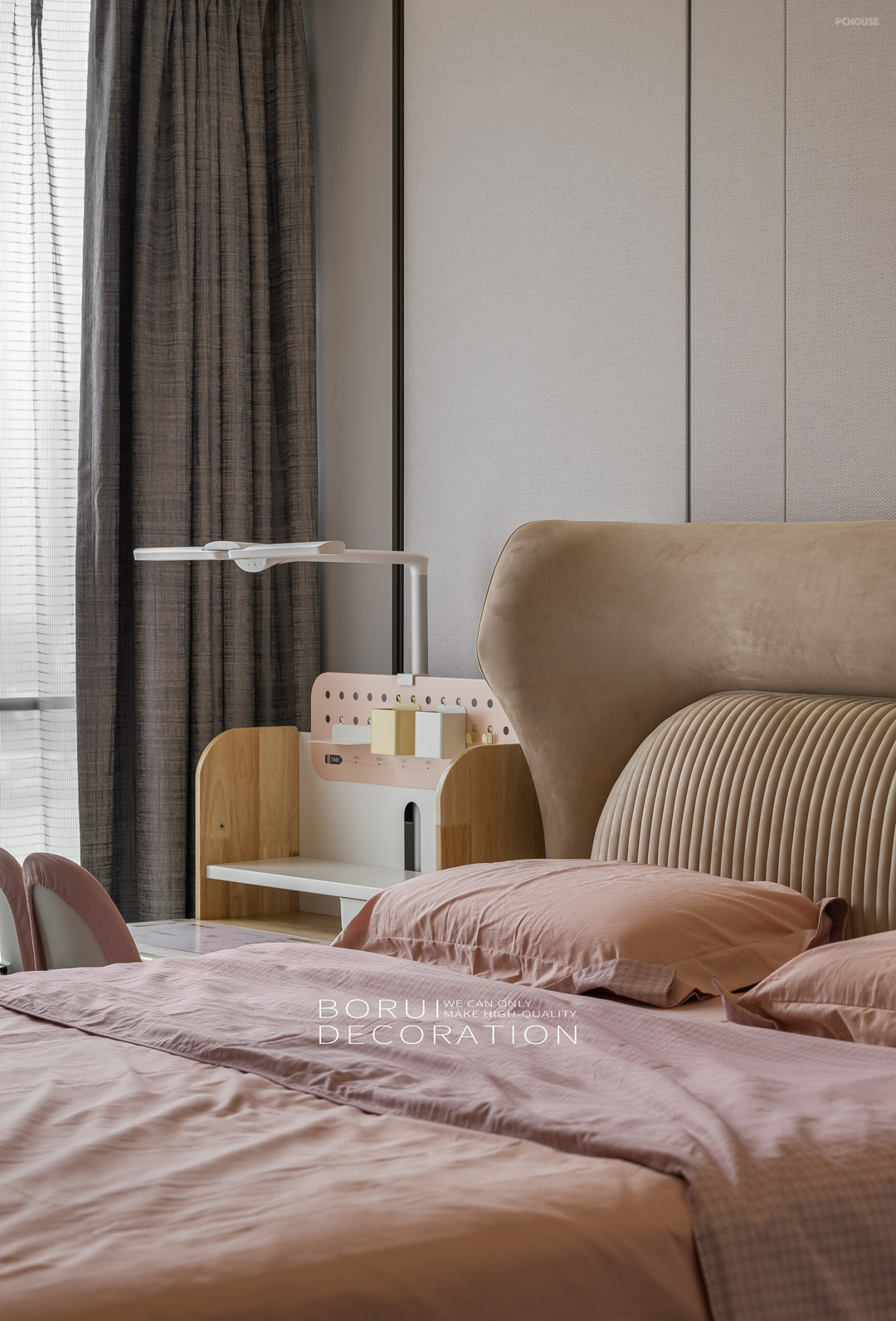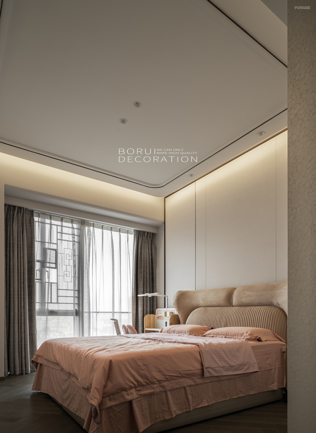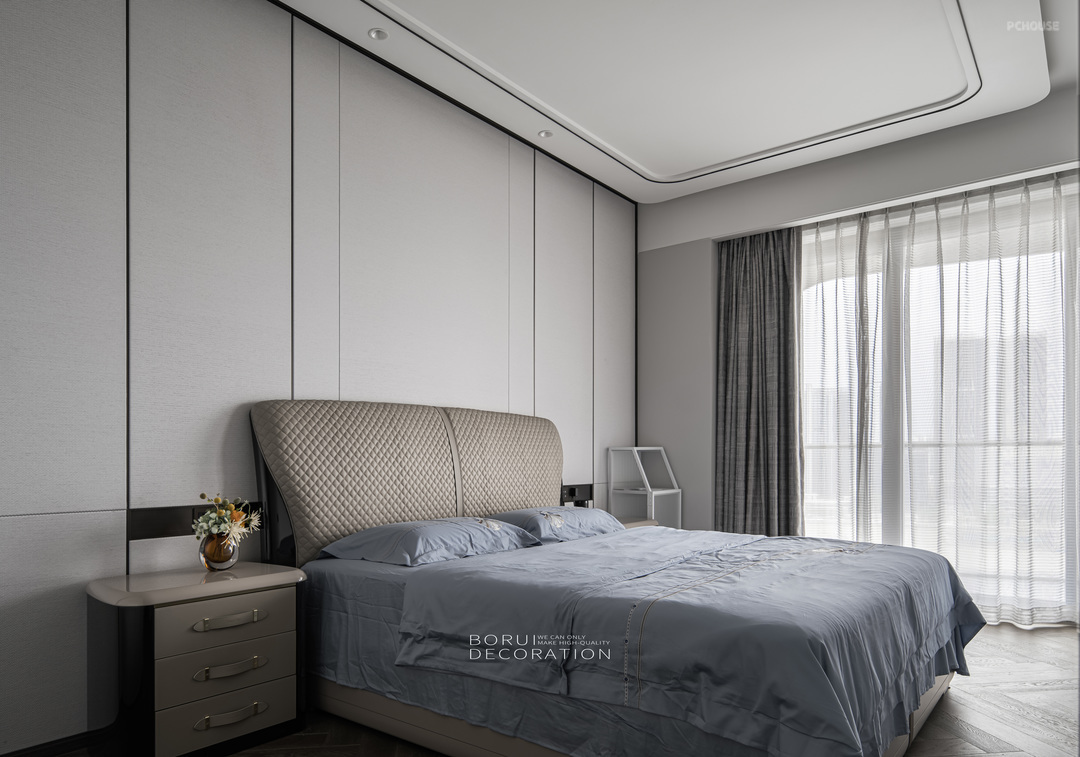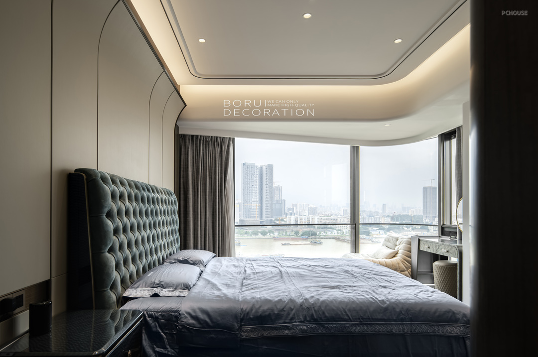 主卧的床尾窗边预留梳妆台,丰富主卧的功能性。床头做了一整面的弧形墙,延伸室内的空间结构,让空间更具有流动感。
