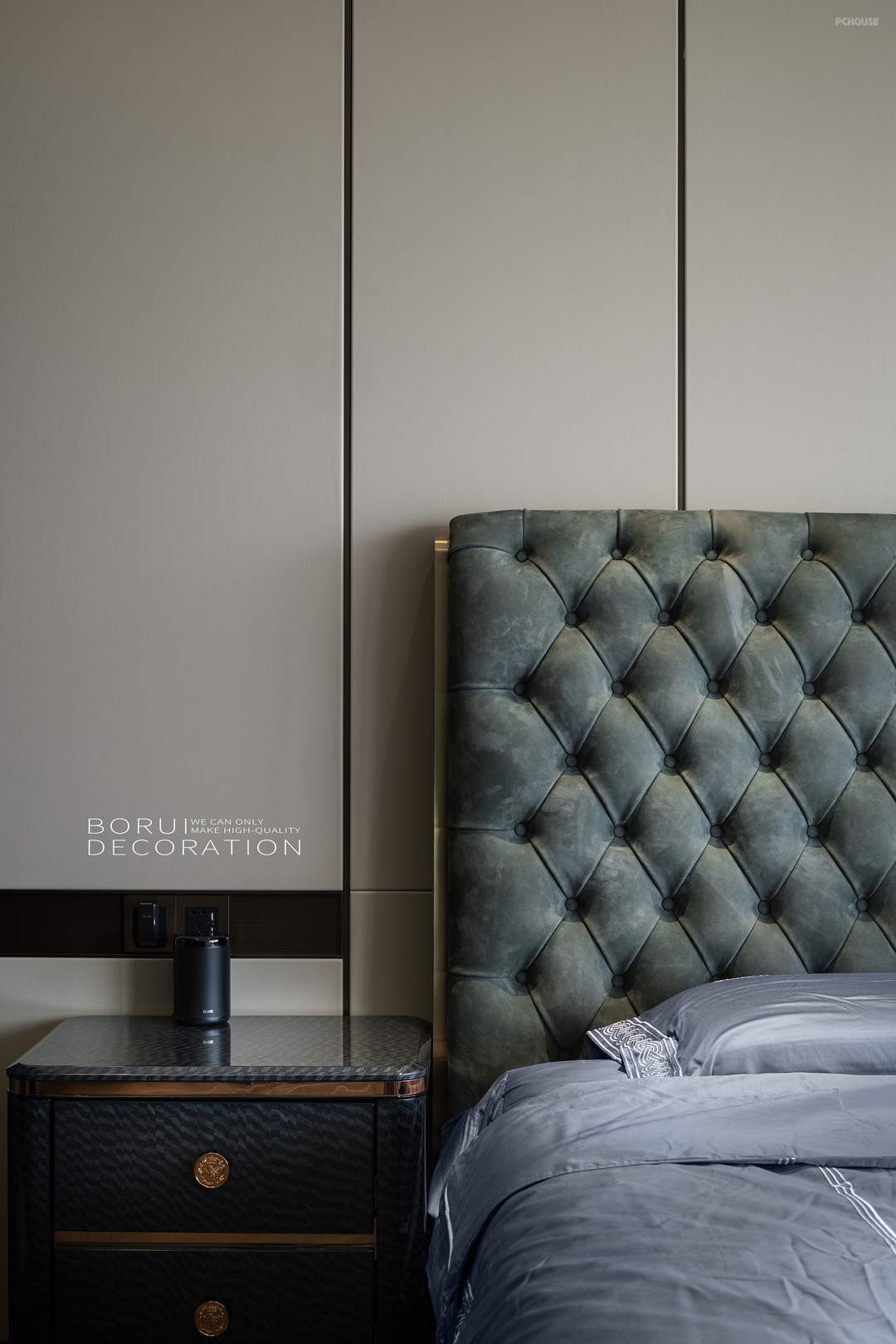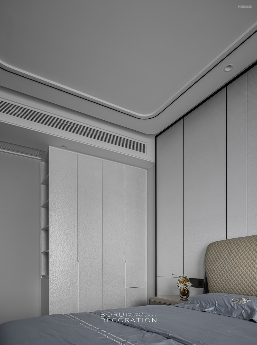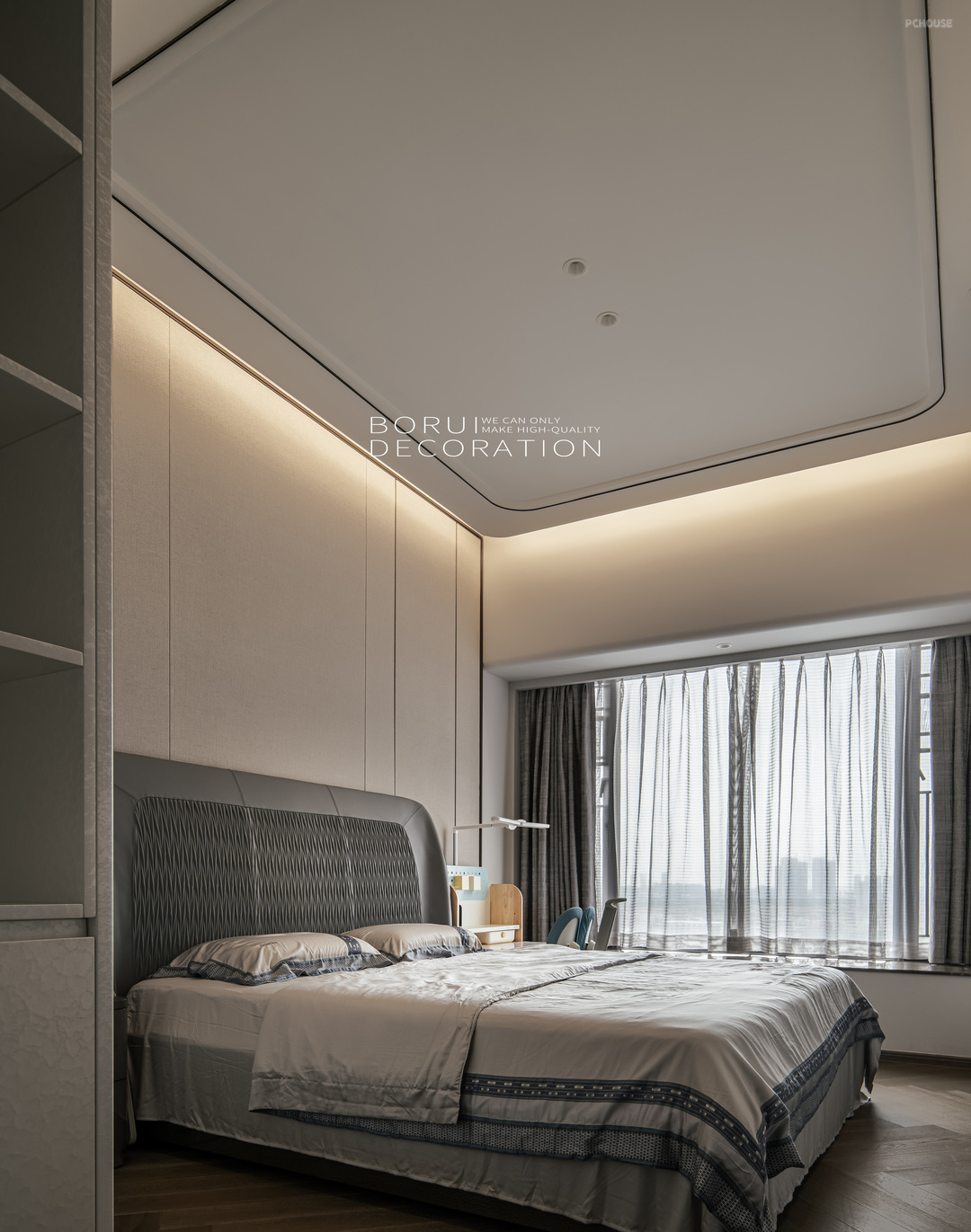 主卧的床尾窗边预留梳妆台,丰富主卧的功能性。床头做了一整面的弧形墙,延伸室内的空间结构,让空间更具有流动感。