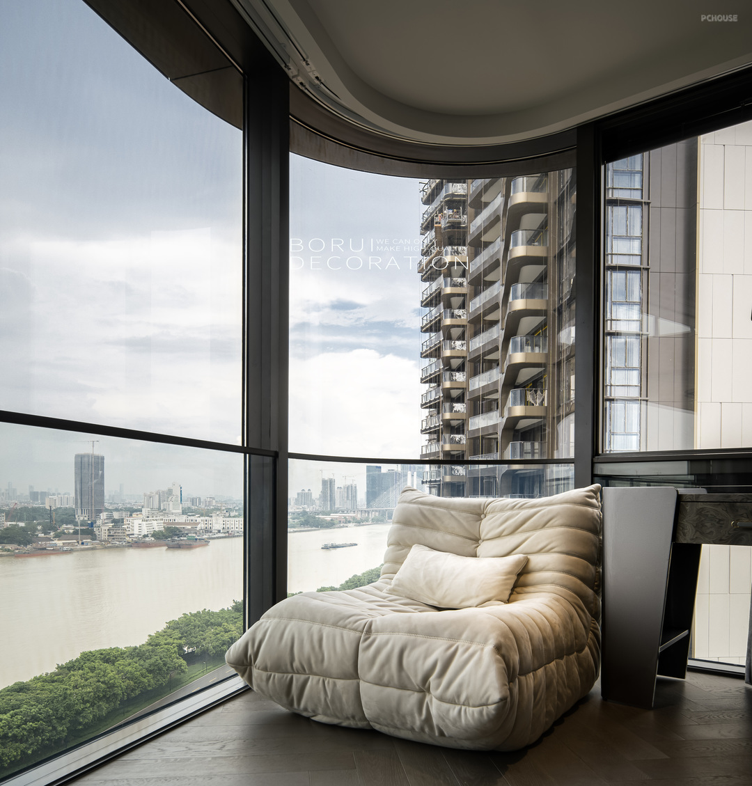 窗边角落是业主的专属休闲区,通过引景入室,保证自然光线与空间的自由流动,弧形落地窗与毛毛虫单人沙发的完美搭配,沙发是经典款,绒布面料+高回弹海绵,非常贴合身体曲线,软软的坐着很舒适,采光和视野一绝,窗外江景一览无余,让卧室最大程度的发挥优势。