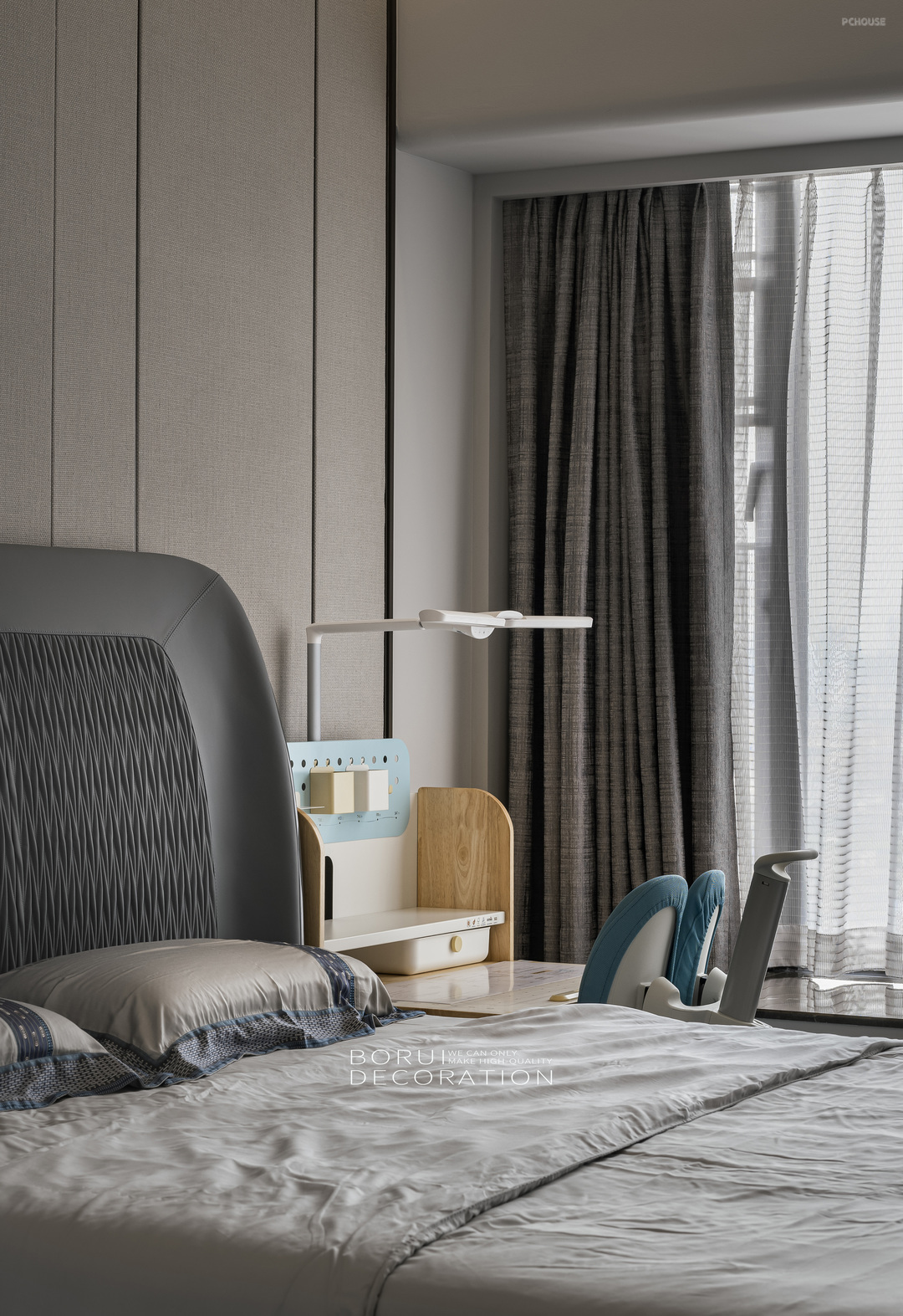 次卧靠墙做了一组一门到顶的衣柜,避免积灰。柜子都是用的烤漆板—贝母漆,保持色调的统一性。一面设计成开放格,可以摆放一些乐高玩具或者小摆件。为了贴合男孩子的青春活泼,挑选了蓝色系的床品,蓝色有助眠作用,可以让孩子更好的进入梦乡。