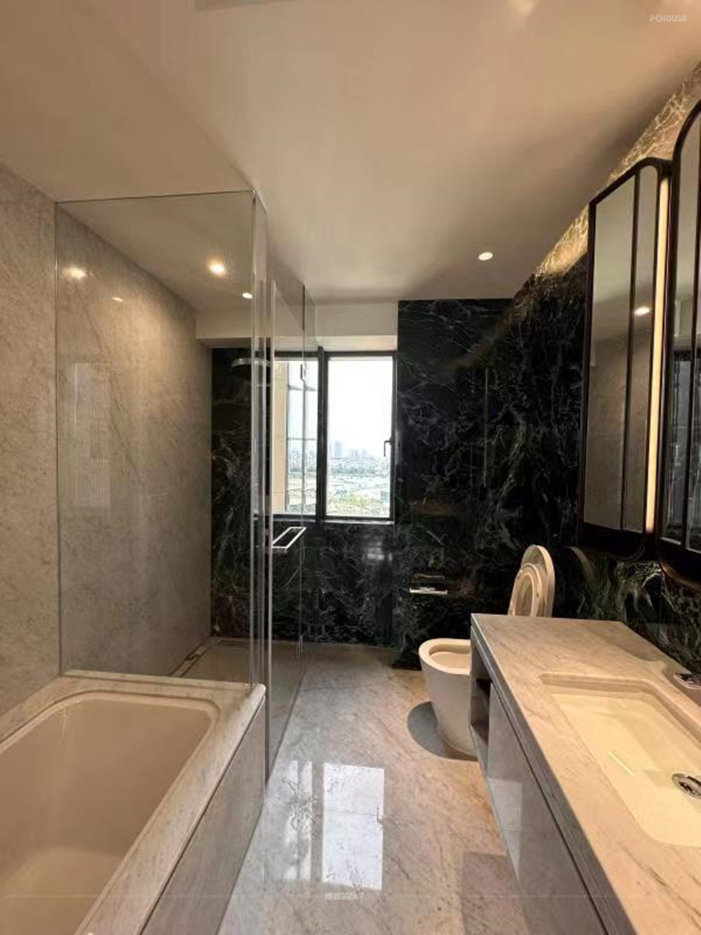 干湿分离的内部设计浴缸+淋浴分隔式设计,淋浴和泡澡互不干扰。淋浴区利用玻璃门做隔断,防止水汽的侵入。