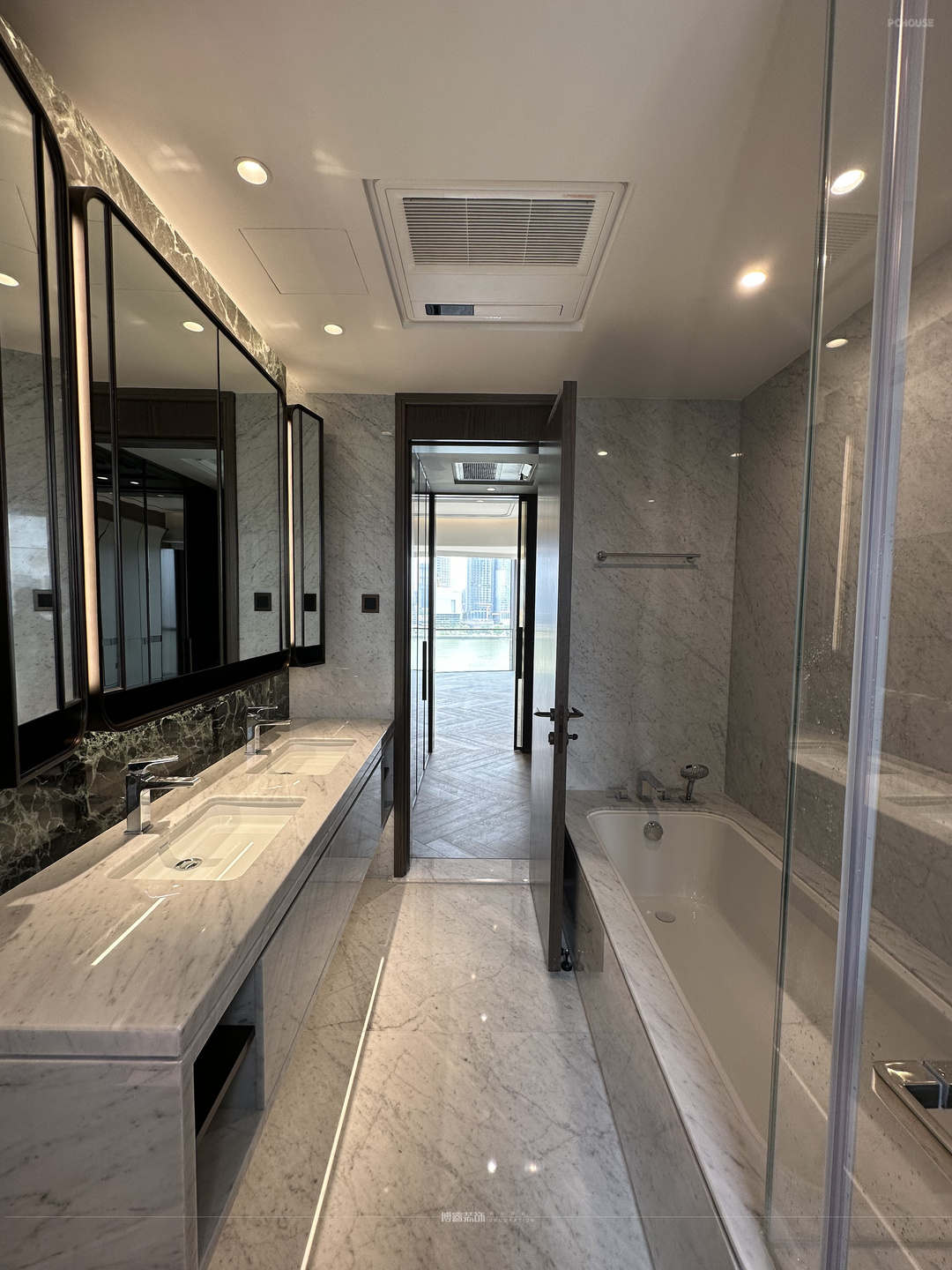 卫生间的墙面和地板都是花纹大理石瓷砖,配合充足的采光,视觉上干净整洁,干区的双台盆设计,日常使用不拥挤,采用镜柜增加储物空间,合理分区收纳。