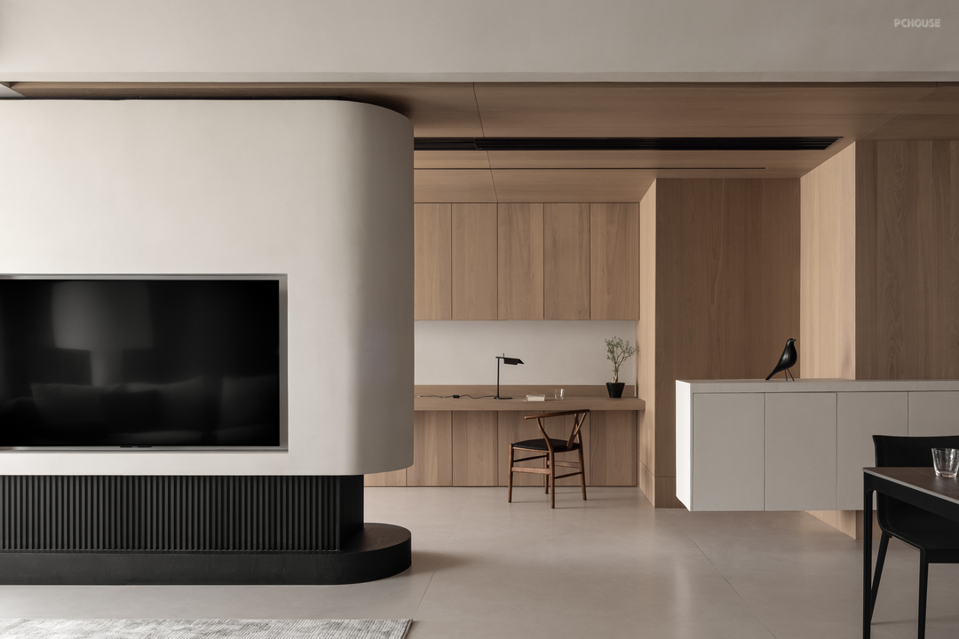 弱化梁柱承重墙是重组空间的一大重点,本案也不例外。所以在打开南向一个次卧后,我们将原本的承重墙设计成电视造型墙和面向书房的收纳柜体。阳台打开后完成以这个承重墙形成一个环形动线,模糊了书房与客厅之间的界限。