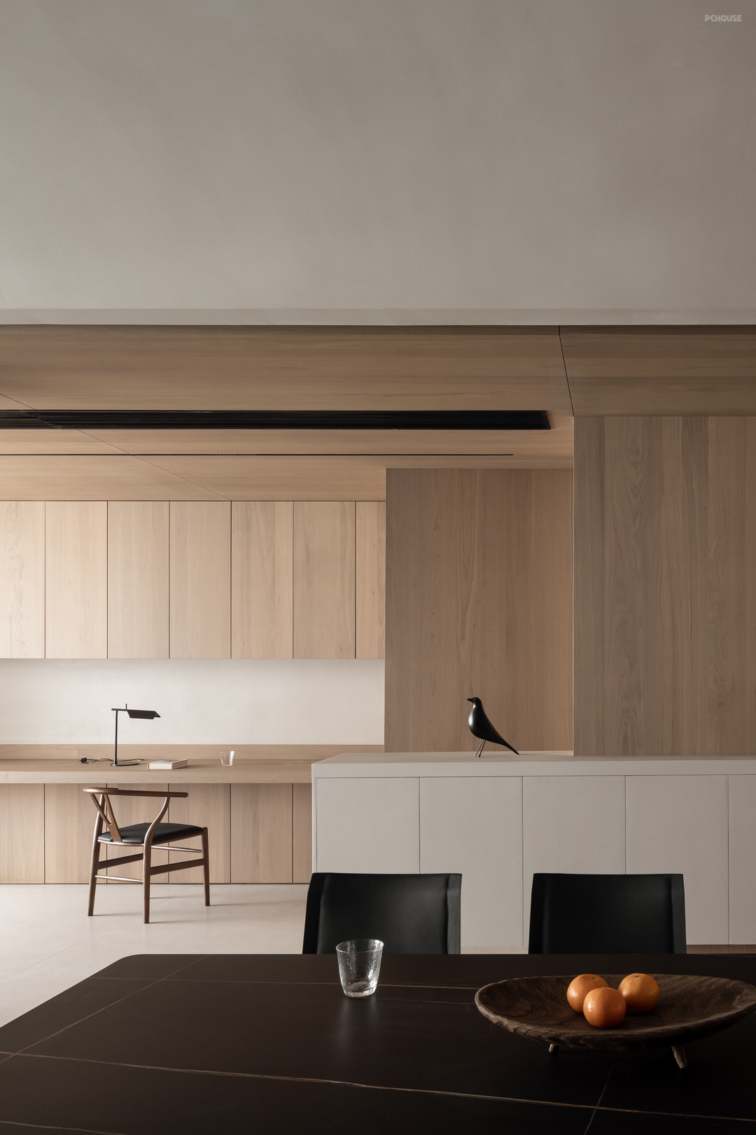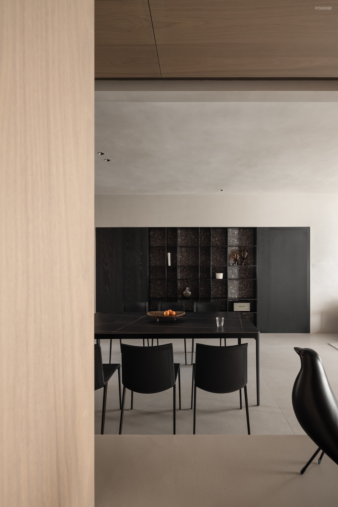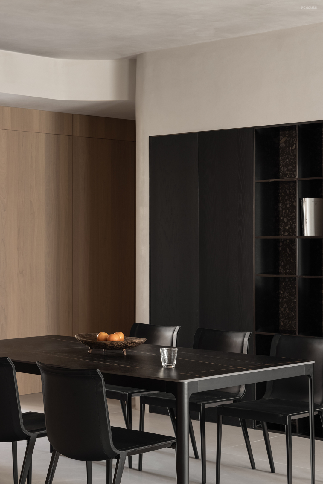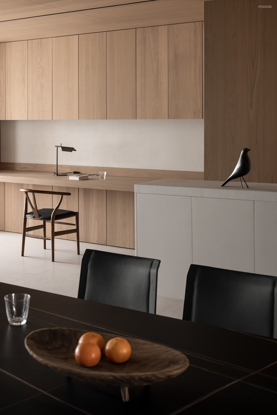 餐边柜的墙面会有一扇改造过的主卧的房间门,设计立面时将房间门和餐边柜设计融合,通过材质的统一,比例高度一致,将隐形门做到更加的隐形,且让餐边柜能做到更大的块面。不会出现高低不一,材质不一等突兀的情况。