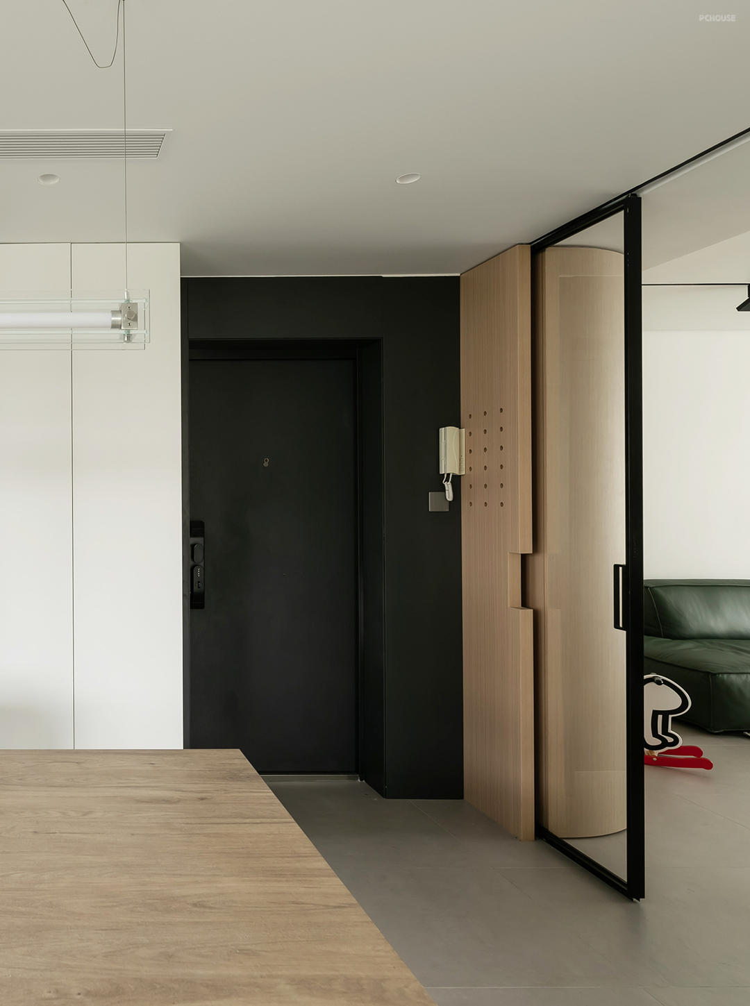 设计师利用客厅靠入户的墙体增加了整面顶天立地的储物柜,转角做了弧形处理;洞洞板隔断和收纳柜中夹了一扇大玻璃移门,这样可以做到让厨房间封闭起来;