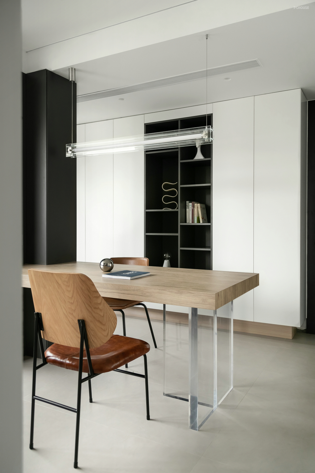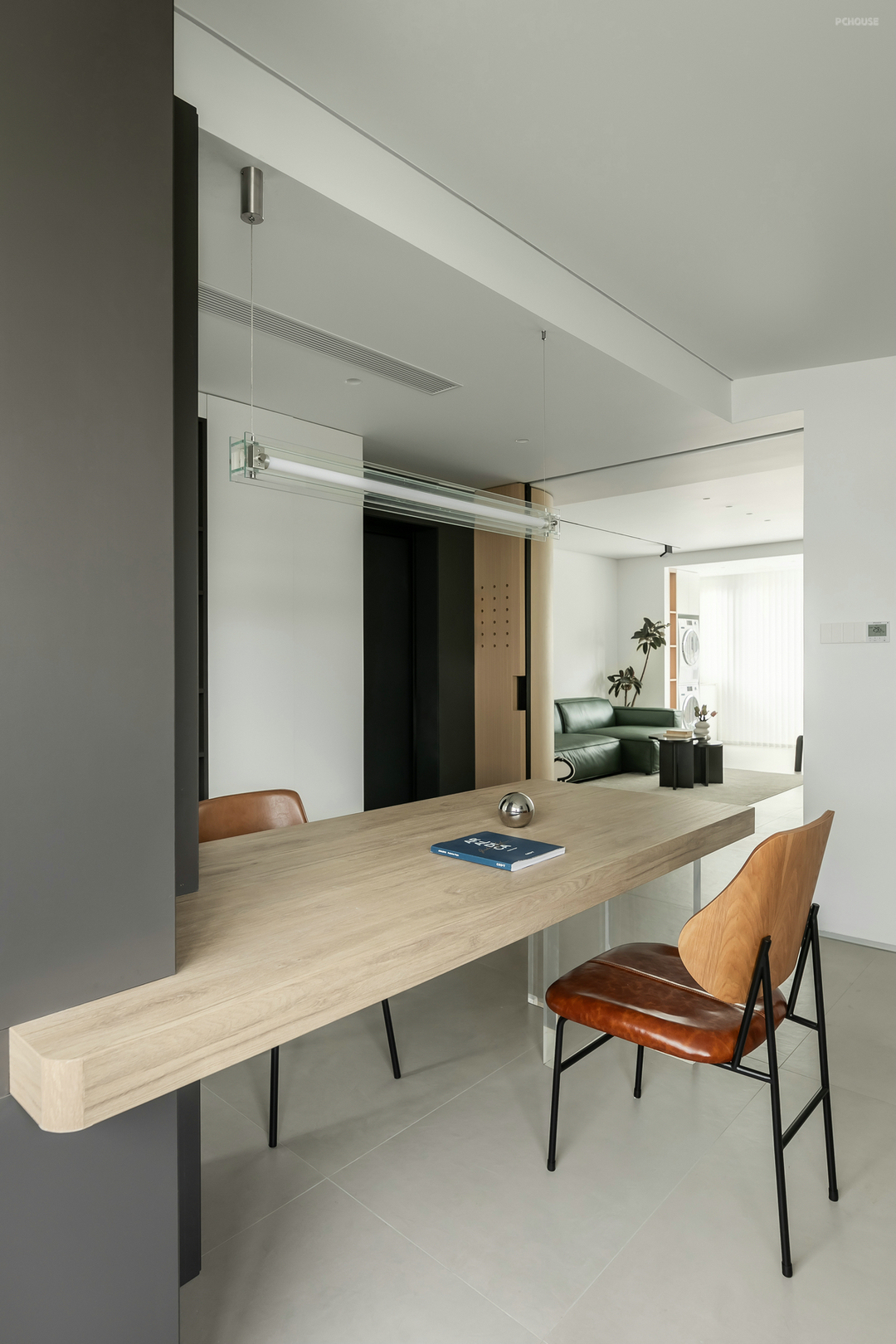 餐厅的木色餐桌与柱点做穿插设计,化难点为设计亮点;