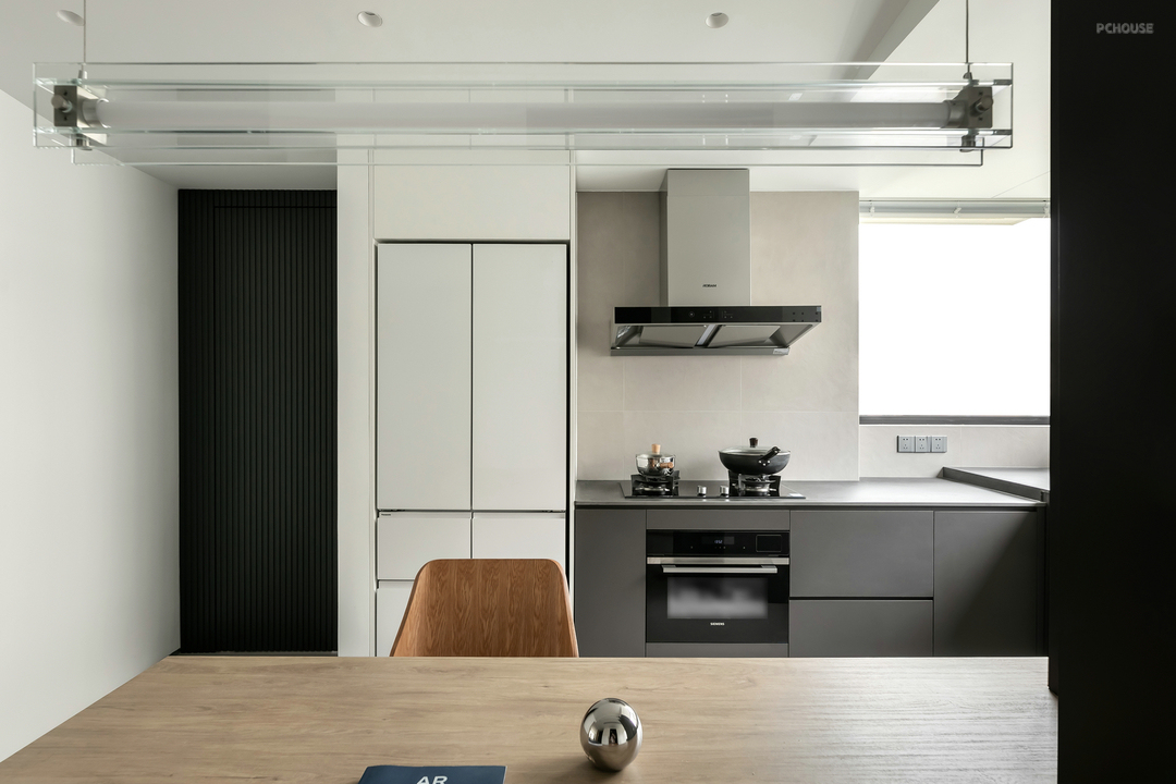 设计师将进门入户右手边的厨房打开,做成了餐厨一体化的大空间,不仅入户视野变得非常开阔,整个空间采光也变得更通透;围绕餐桌把厨房操作区域,餐边收纳柜、嵌入冰箱和入户鞋柜等不同功能需求区,非常完美的连贯串通起来;