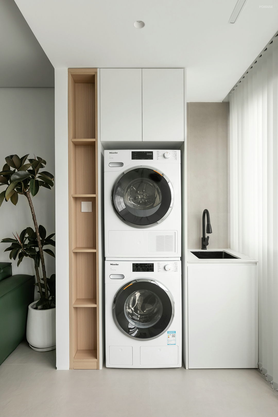 阳台另一侧设计了洗衣柜+洗手台满足日常功能需求,解决家政收纳保证空间的整洁;