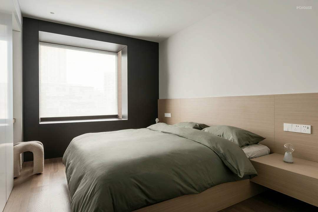 飘窗位置整墙做了深色的护墙,增加了空间纵深感;