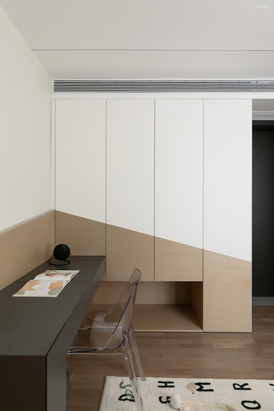 儿童房做了悬浮地台的设计,在地台上可以放床垫当做床使用,多出的区域可以做儿童娱乐玩耍空间,阶梯式的地台设计为小朋友活动增加了更多的趣味性;