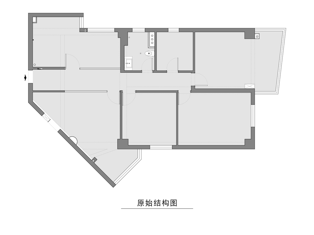 原有户型是一个斜面的异形空间,客厅家具很难摆放,空间利用率较低,客厅阳台的窗户在斜角里面,很难把光线带到客厅,所以室内客餐厅采光不太好;