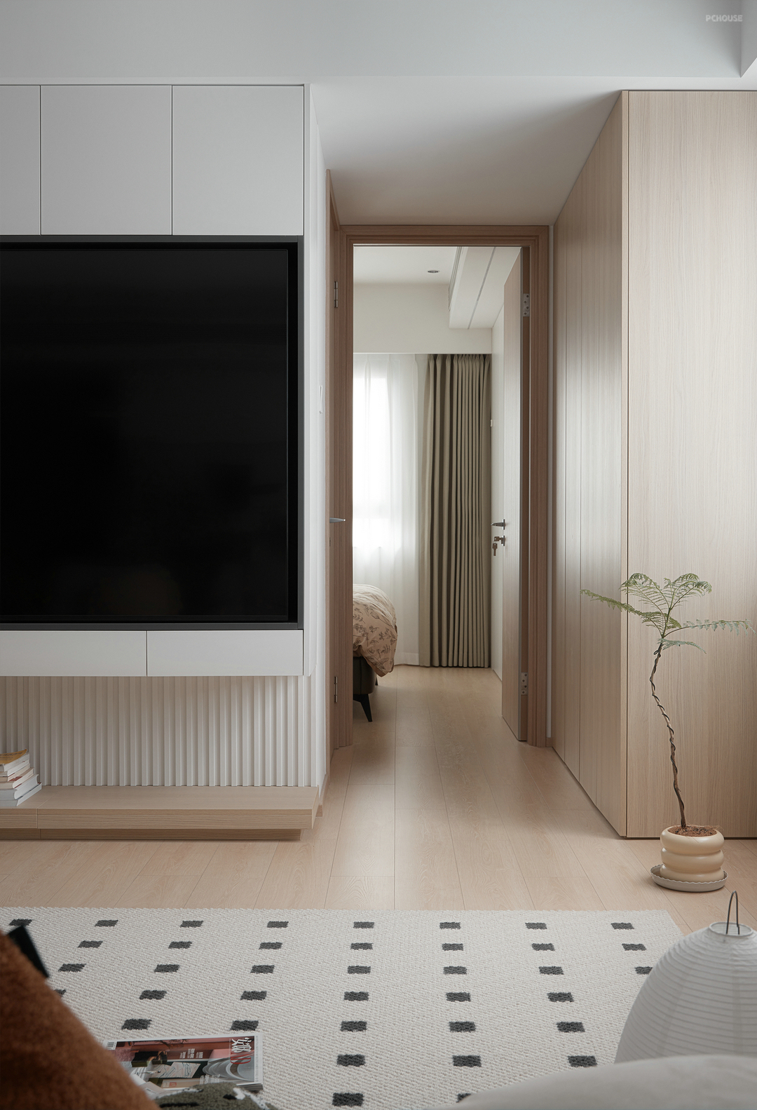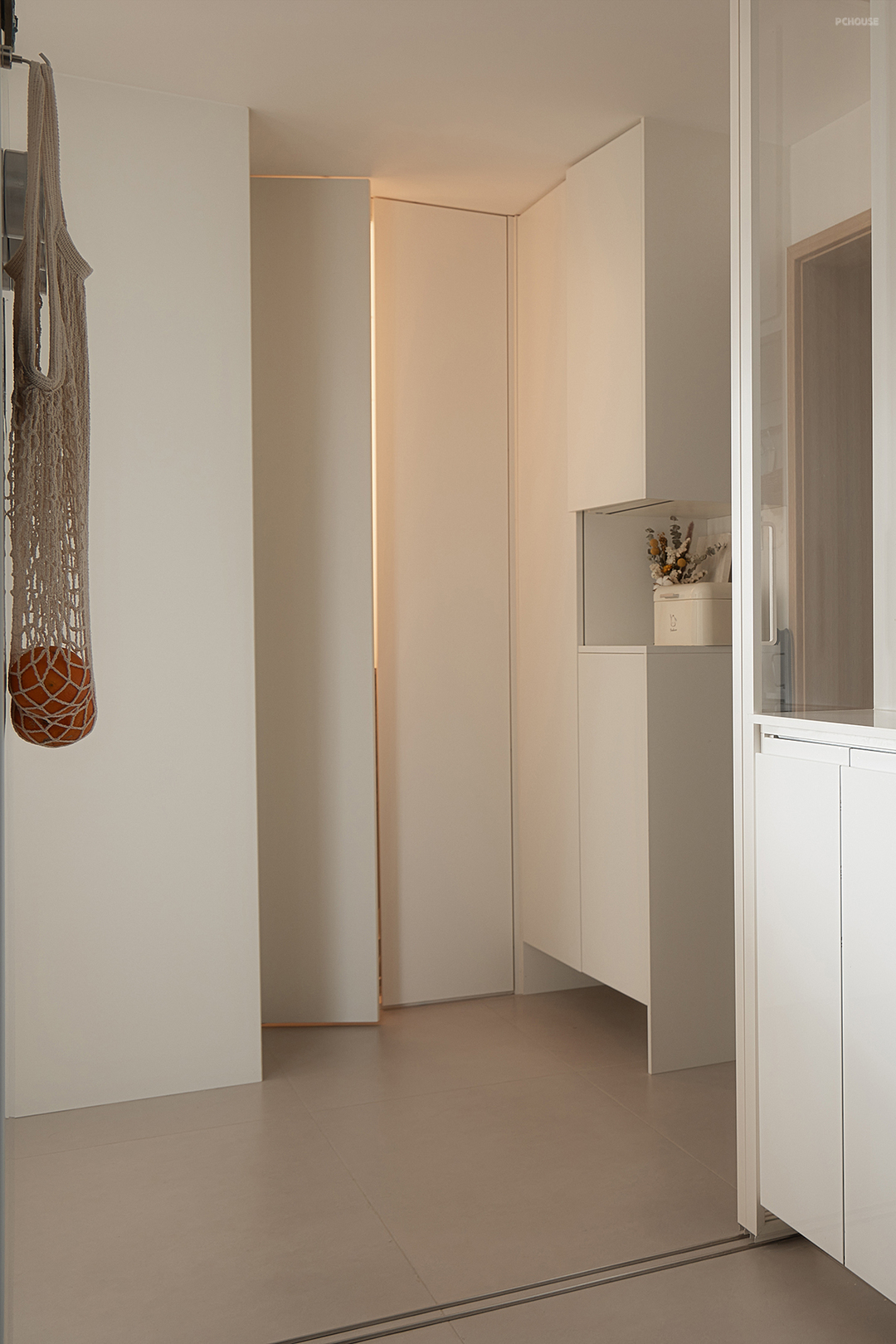 这个视角可以看到入户鞋柜和储物间,统一色调的白色门板可以提亮空间;