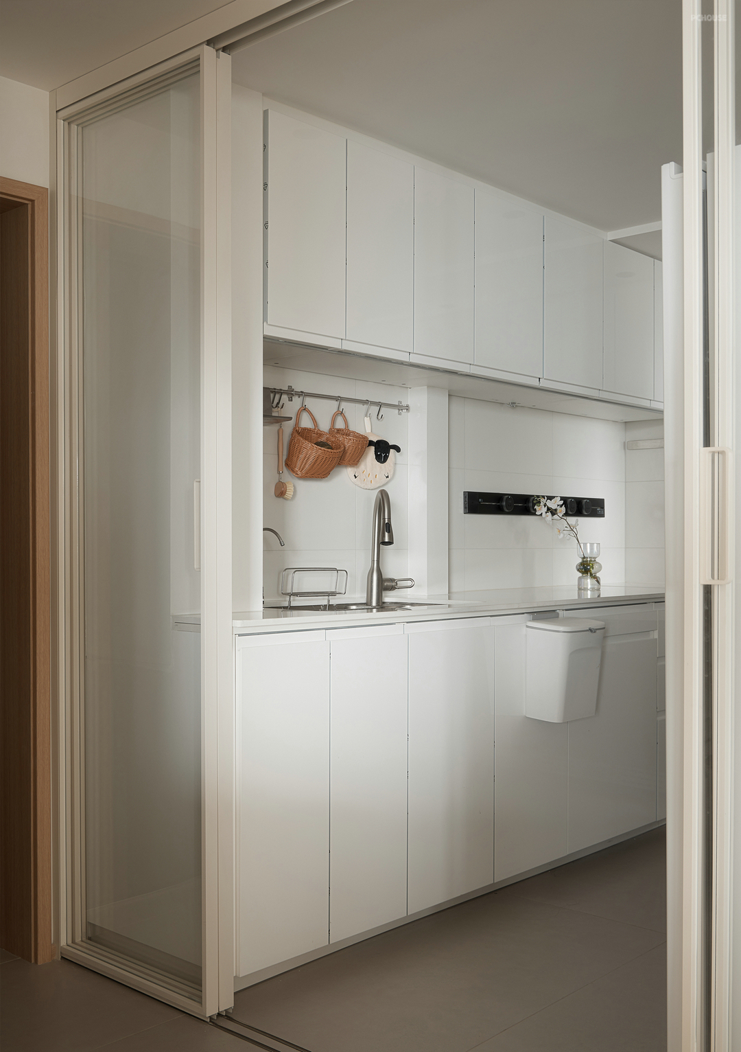 屋主起初希望厨房和餐厅做开放式,与客厅有联通互动,设计师综合考量说服厨房通过玻璃移门达到可开可合的形式,有效避免油烟也能做到开放;
