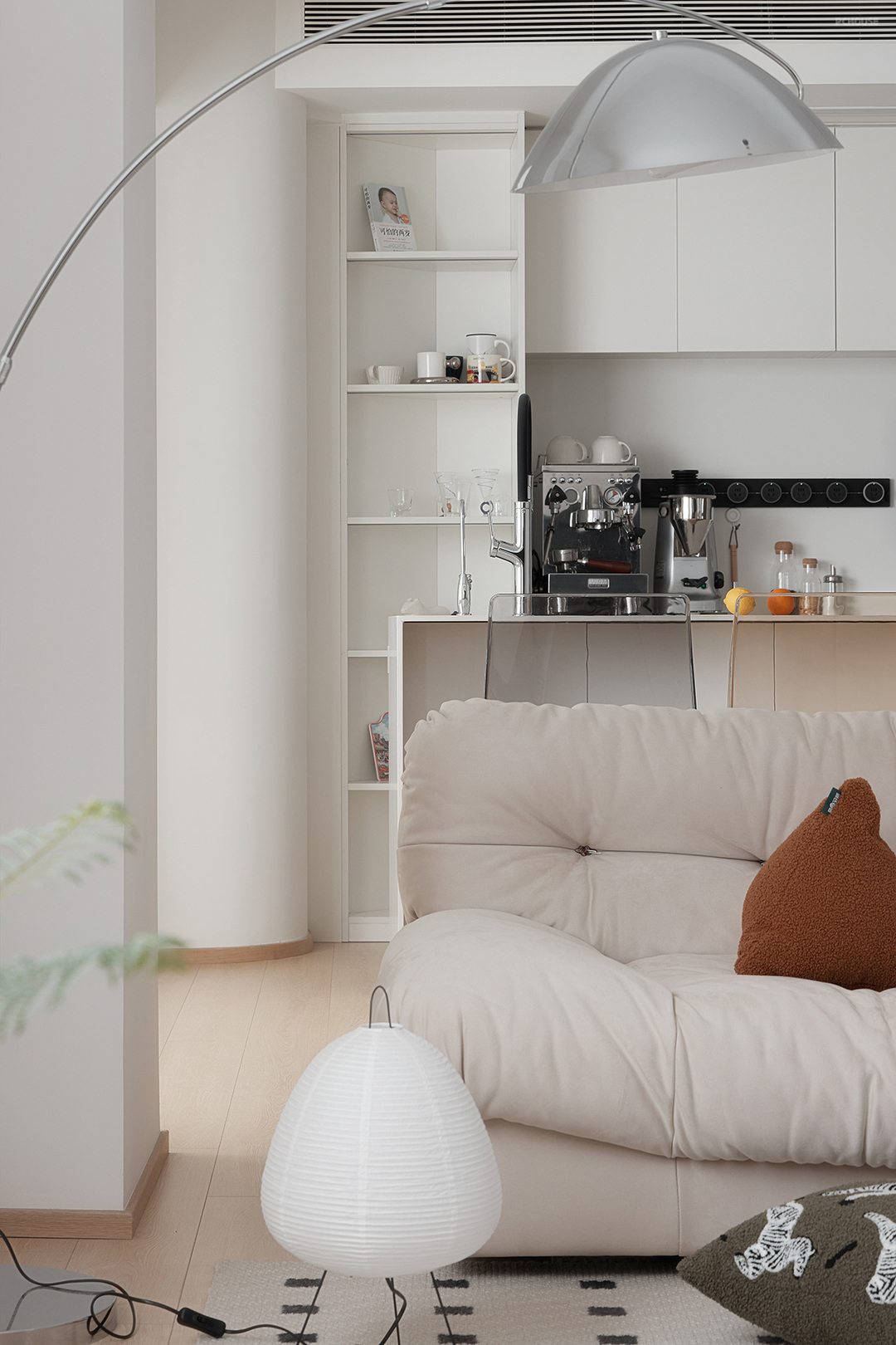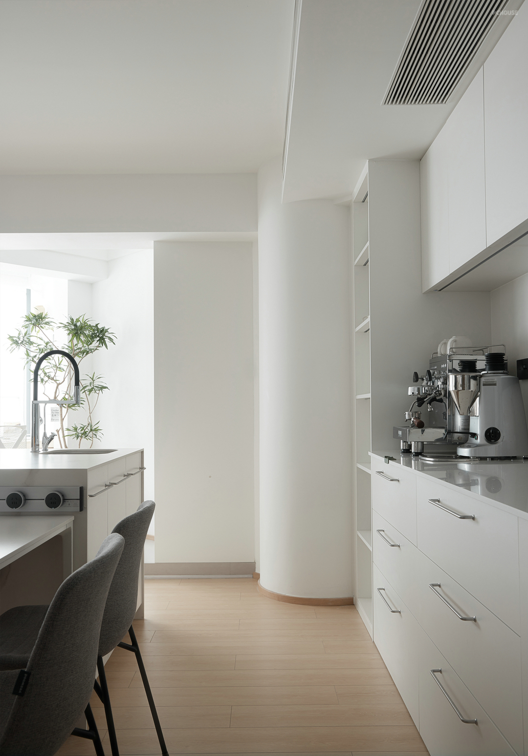结合入户衣帽柜设计了餐边柜,上下柜的设计增加了咖啡机、烧水壶等小家电的摆放区,也为餐厅收纳带来了方便;