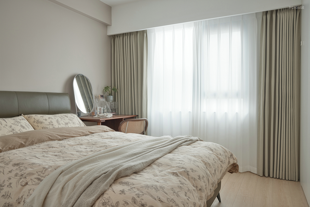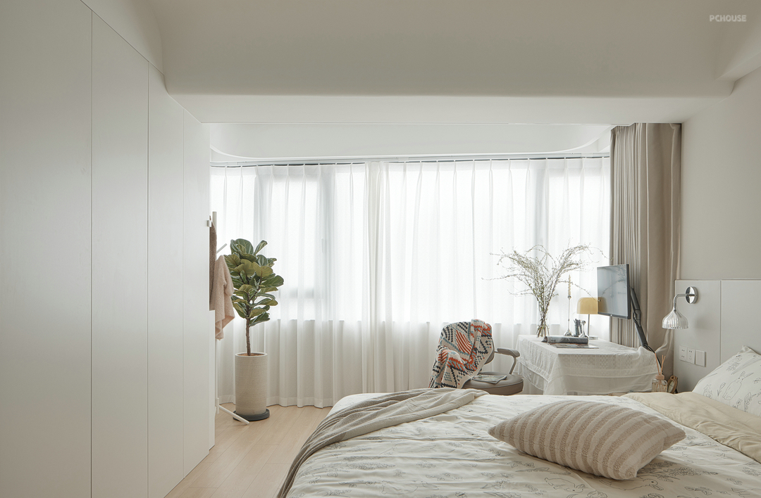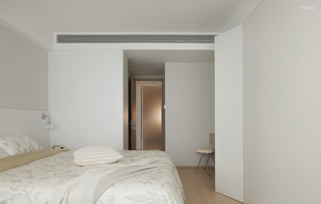 次卧作为父母偶住的房间使用,门在客厅方向,空间有了很好的延伸,光线做到了联动,借用原有次卧的面积配比,