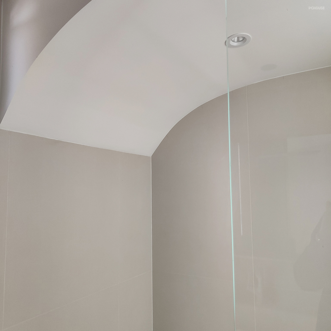 由于打开空间,就会出现更多的大梁和边边角角墙垛,都不是一般的宽大而厚重,设计师与屋主沟通下来,采取了弱化梁的想法,就有了弧形吊顶(内嵌线性灯)增强空间的亮度和氛围,弱化吊顶低的即视感,这也极其挑战师傅们的手艺;