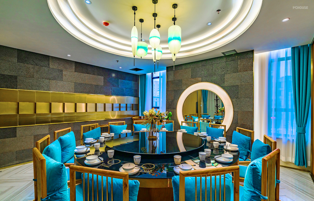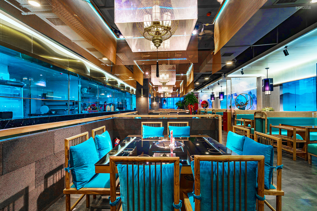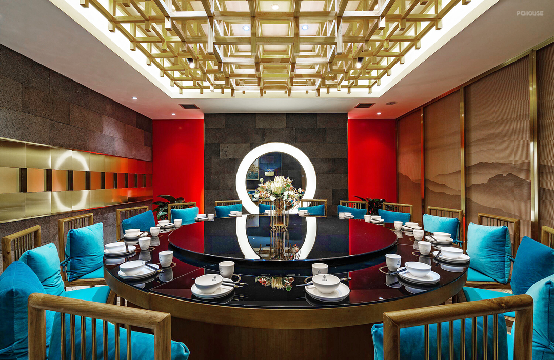 散台区域专门安排了8人坐的位置,去分散包厢少的压力,在经营上,设计师也同样下足了功夫,特别是用金色和蓝色来提升整个空间的气质,在视觉上给人一种宁静祥和,色彩在时间不断的变化的过程中由你宁静变得暧昧,又由暧昧变得冷静,让空间变成了流动、变化且调性极高的空间。