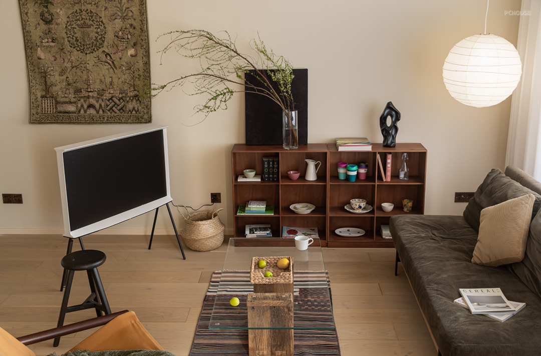 在墙面上挂上了一块来自伊朗ZAMANI的手工波斯地毯,它不仅可以起到装饰作用,还可以为整个房间增加文化气息,与地面的地毯相互交映着。我们在客厅的一角摆了一幅艺术画框的电视,这样可以让整个房间更加时尚和现代化;小众电影播放着,我们窝在一起尽情享受这安稳静谧的时光。