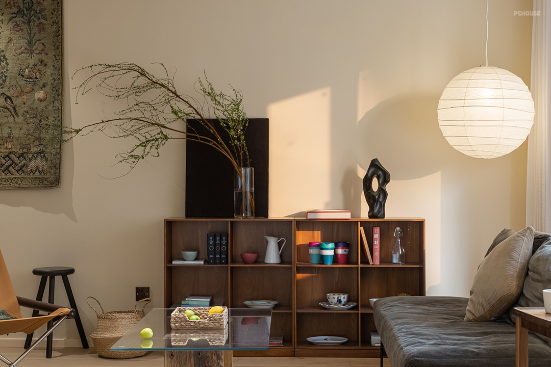 奶油色的墙面,让整个空间看起来更加温暖和亲切;再配上浅木色的木地板,整个房间的视觉效果更加和谐,而且营造出了一个自然、舒适的氛围。中古风的各种元素在这个空间中,让整个房间充满了氛围和生命力。