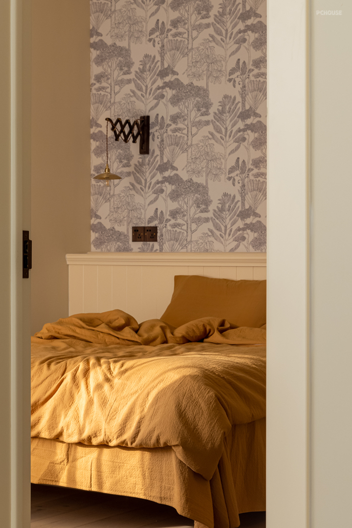 床头柜采用的是THE MAZAY模块柜,不仅实用,还具有装饰性。在床的另一侧,配有一个复古可伸缩壁灯,可以随时调整光线的角度,让光线变得更加柔和、温馨,恰到好处地打造出安静的睡眠环境。