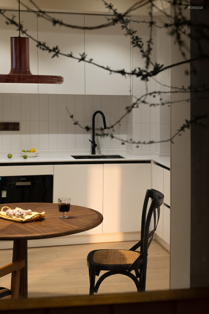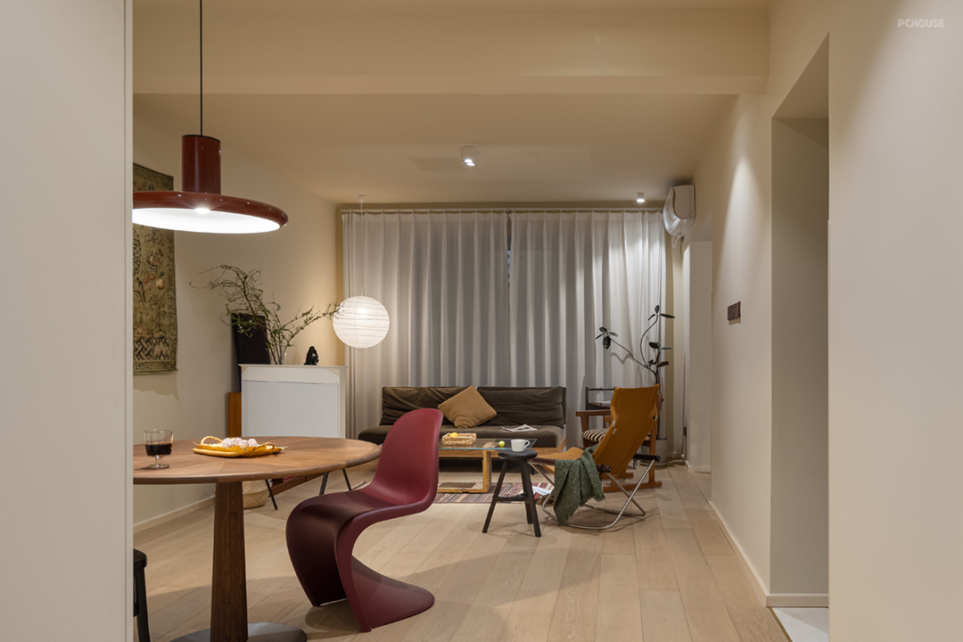 在这个餐厅区域,我们甄选了设计师款单椅餐桌,每一张餐桌都有着独特的造型和寓意,使得用餐时更具有仪式感。与此同时,多立克实木圆桌和瑞士Vitra Panton chair潘通椅的运用,使得整个区域属于中古与现代的结合。在这里,新与旧巧妙相逢,日常而平凡的生活也得以焕发新的体验。