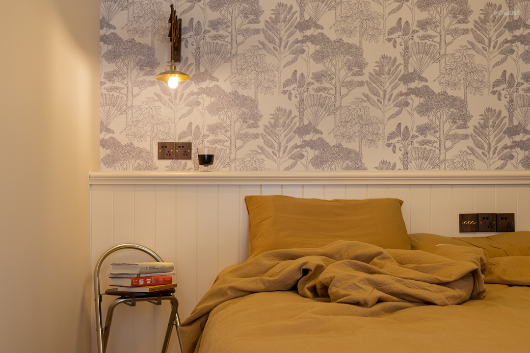 睡眠区的设计恰到好处,没有过多的装饰,但是依然显得精致。半腰的素描壁纸与整个房间的风格相得益彰,同时也增加了一份艺术气息。胡桃木的插座纯铜按钮带着复古高级感,给人一种品质上乘的享受。整个房间的色调也很柔和,让人感到非常舒适。