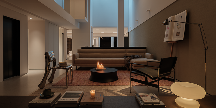 5m的高度大气通透,尖顶设计加美式黄铜吊灯,融合了现代的简约与复古的艺术气息。