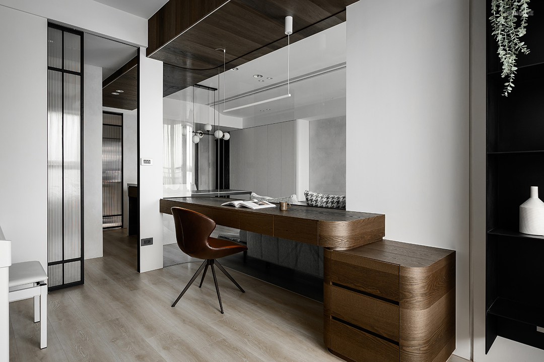 在玄關以巧思設計出窗台的端景視覺,接著在木質元素的運用下,降低天花板橫樑的壓迫感,同時以弧形設計構成局部的天花板、窗簾盒、書房玻璃隔間,營造空間柔和圓潤的舒適氛圍,同時在細節注入巧思,將電視櫃以木工與鐵件方式做結合,同時運用弧形轉角的方式銜接一旁的系統櫃體,將細節的收尾做到最好,也讓空間的質感氣息增添不少,最後透過線燈、造型吊燈、間接光源的鋪陳,使得整個居家表情烘托出迷人優雅的放鬆時刻。