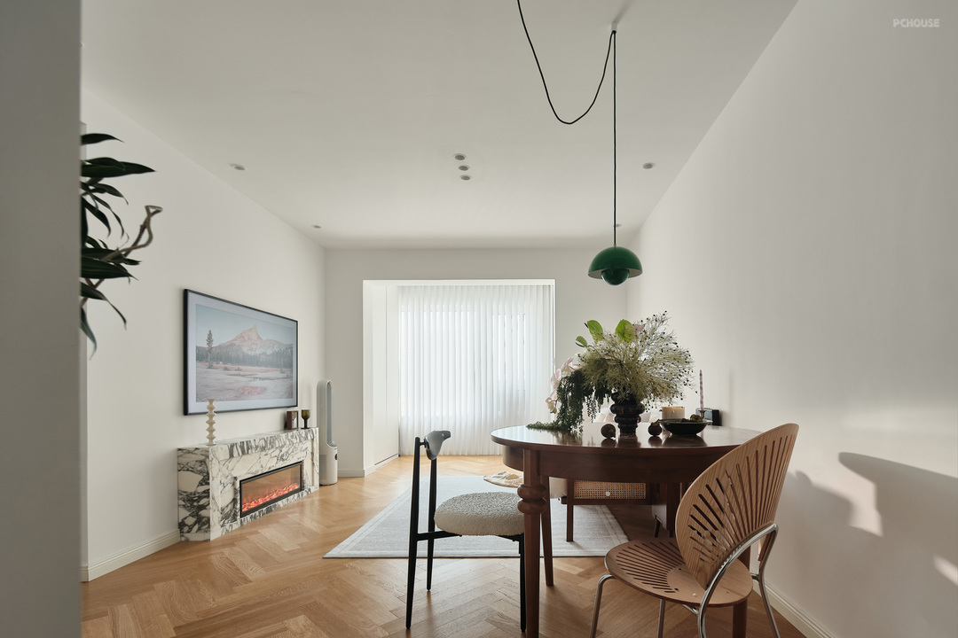 从客厅看向餐厅视角,在硬装上,我们力求极简,将客厅、餐厅、入户视觉一体化,从而让空间显得更大。