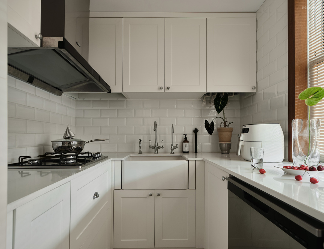奶油色定制柜搭配暖白色的面包砖以及胡桃木色的窗套线,形式上追求不过时,功能上必须舒适实用;我们想延伸极简的同时保留精致的怀旧艺术。
