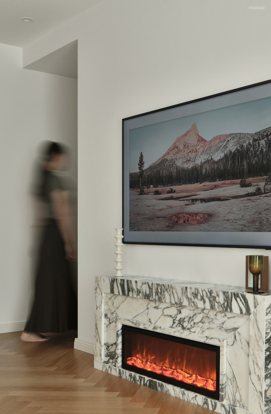 电视背景,我们规划了壁炉搭配壁画款电视机。