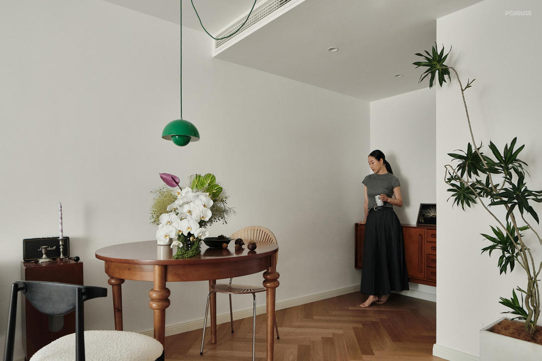整个空间除墙体和定制柜是暖白色以外,我们通过木色地板及中古家具等重色来丰富空间的层次;我们希望空间是 安静温馨、怀旧温情、明亮优雅的。