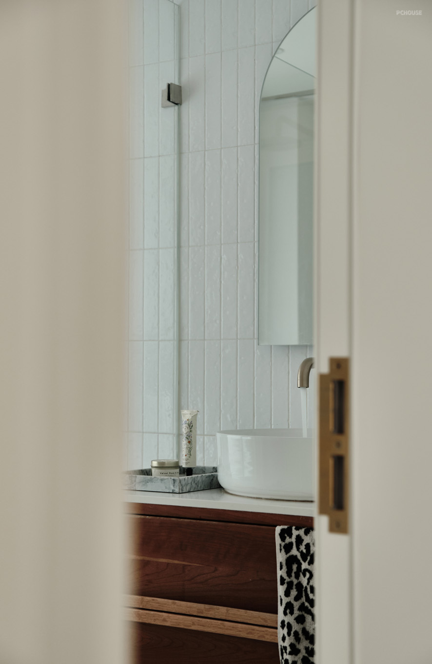 卫生间同样延续了整体空间家具的氛围,胡桃木的浴室柜,让简单的空间有点复古的味道。