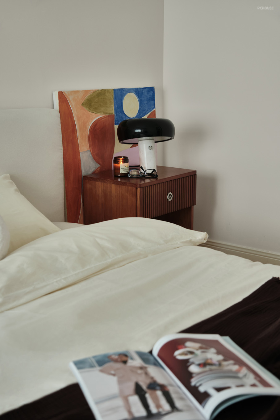 主卧主要以休息为主,所以整体空间我们以明朗简单的色条为主,这样也有利于助眠。