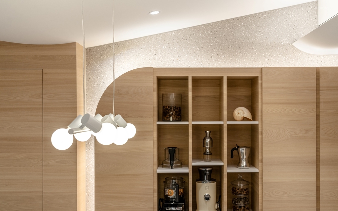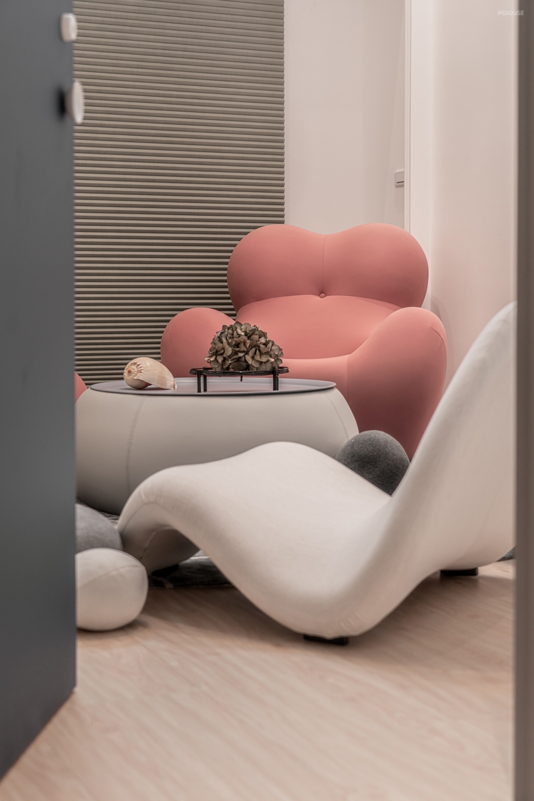 在高度現代感的空間,透過馬卡龍粉嫩色彩為空間營造歡樂幸福的氛圍,透過曲線的弧形線條,串聯上下樓層個個區域,運用石與木的自然紋理與特質,增添自然與藝術之美,令空間完全展呈其流動性、產生靜與動、剛硬與婉柔間的強烈對比。設計團隊在意象裡構景造境,輔以曲度紋理交融的藝術思維,成為室內風格的標記。