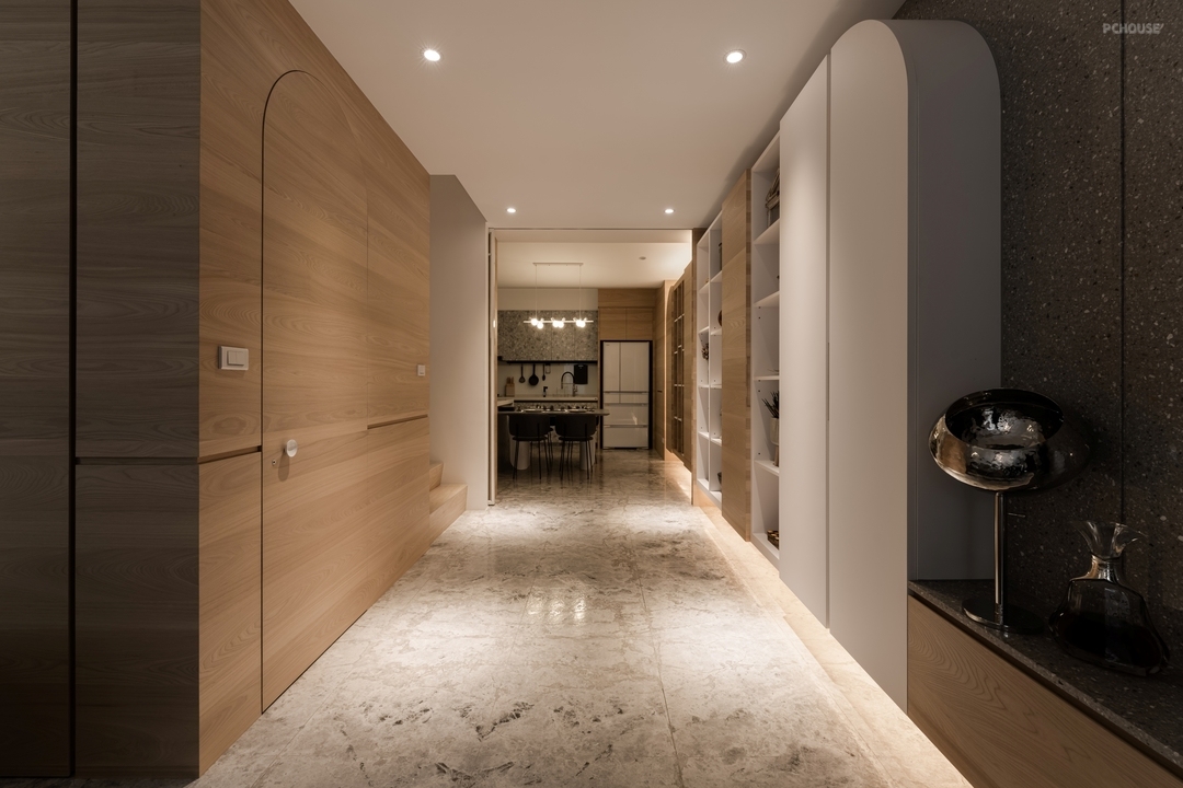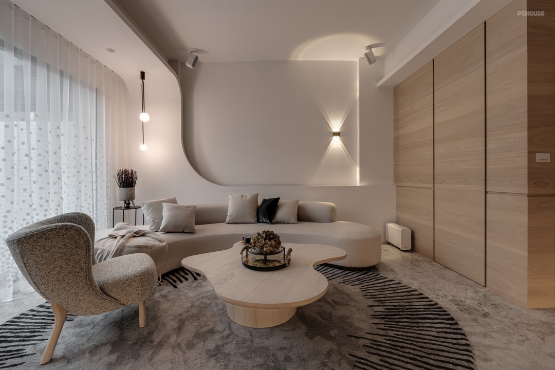 一樓廳區以米白色為背景,沿著灰階石材、實木材料、間接光氛錯落而成、解構層次,有序地依著弧形線條的轉繹,進入開放大廳,圍塑優雅輕盈、和諧柔美的空間質感…