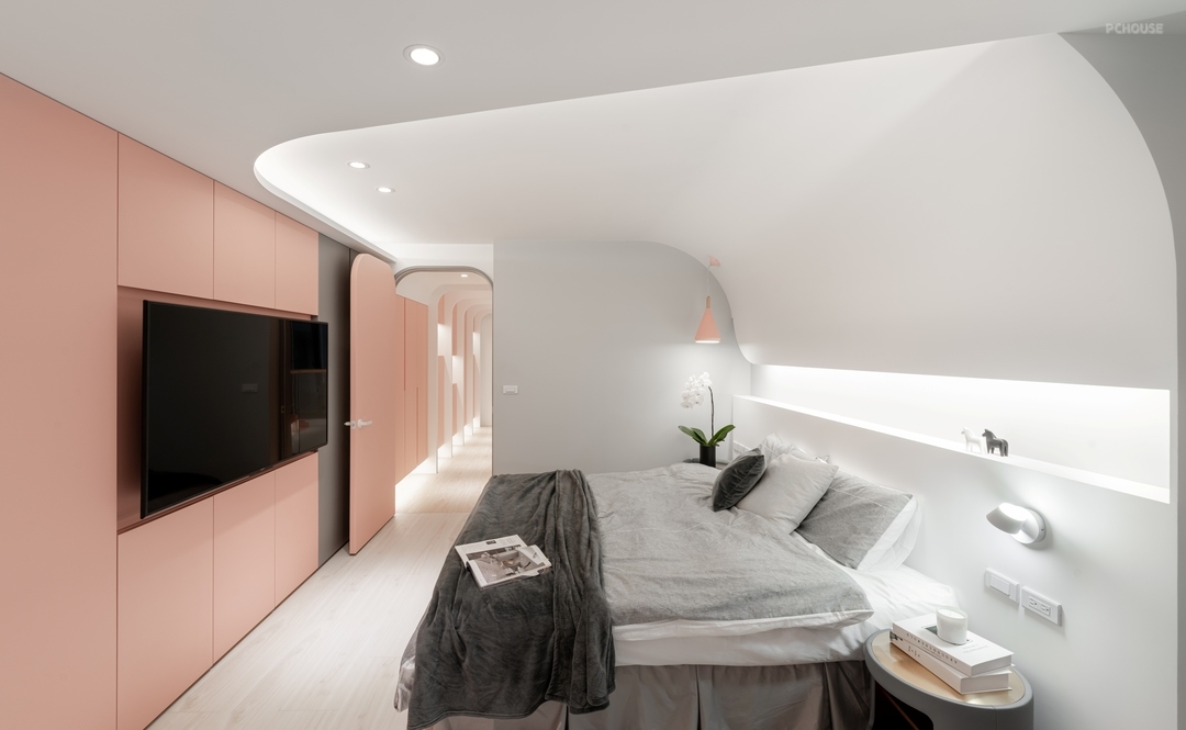 四樓擁有建築挑高優勢,規劃為全齡共享的娛樂區域,投影屏幕、中島吧檯,提供舒適放鬆的休憩時光。次臥房以粉嫩色彩融合灰階顏色,讓休憩時光沉浸在甜美、穩重之間…天花圓弧曲線與光影共構和諧柔美,為空間點綴亮點。