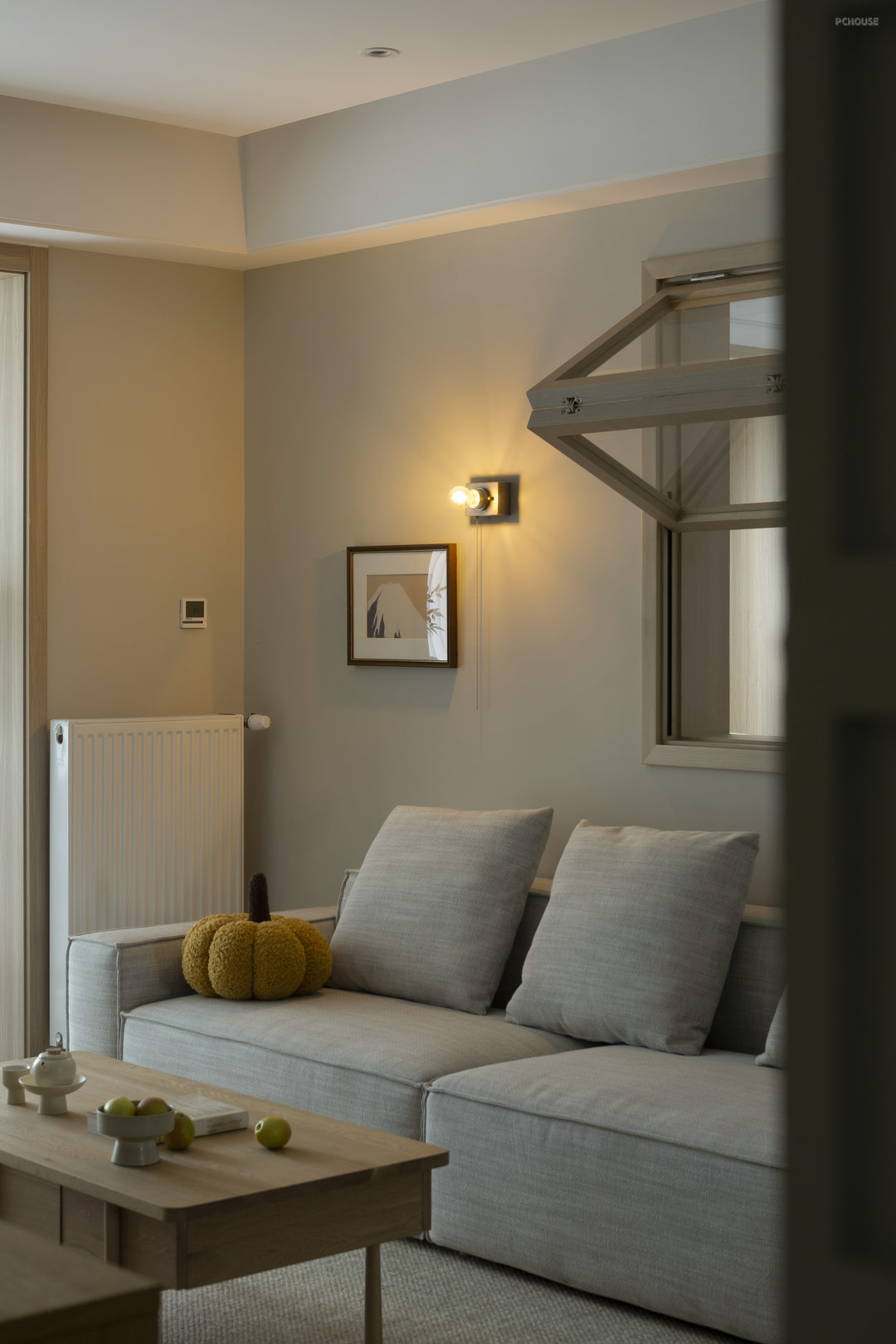 沙发墙墙体局部掏空,链接书房的位置通过木质折叠上翻窗增加了两个空间的链接互动感,也使得原本密闭的书房更加通透。拆掉观景阳台的推拉门,将阳台区域纳入到客厅。使其更加通透。再通过门改色刷漆,使得原本精装房的室内门颜色跟后期的定制柜体木色做到和谐统一。灰色的布艺Linosa沙发在简洁的基础上提供了最大的舒适感。上翻窗旁的复古拉绳相机灯,轻轻一拉,橙黄的钨丝灯泡照亮了旁边的“富士山下”。